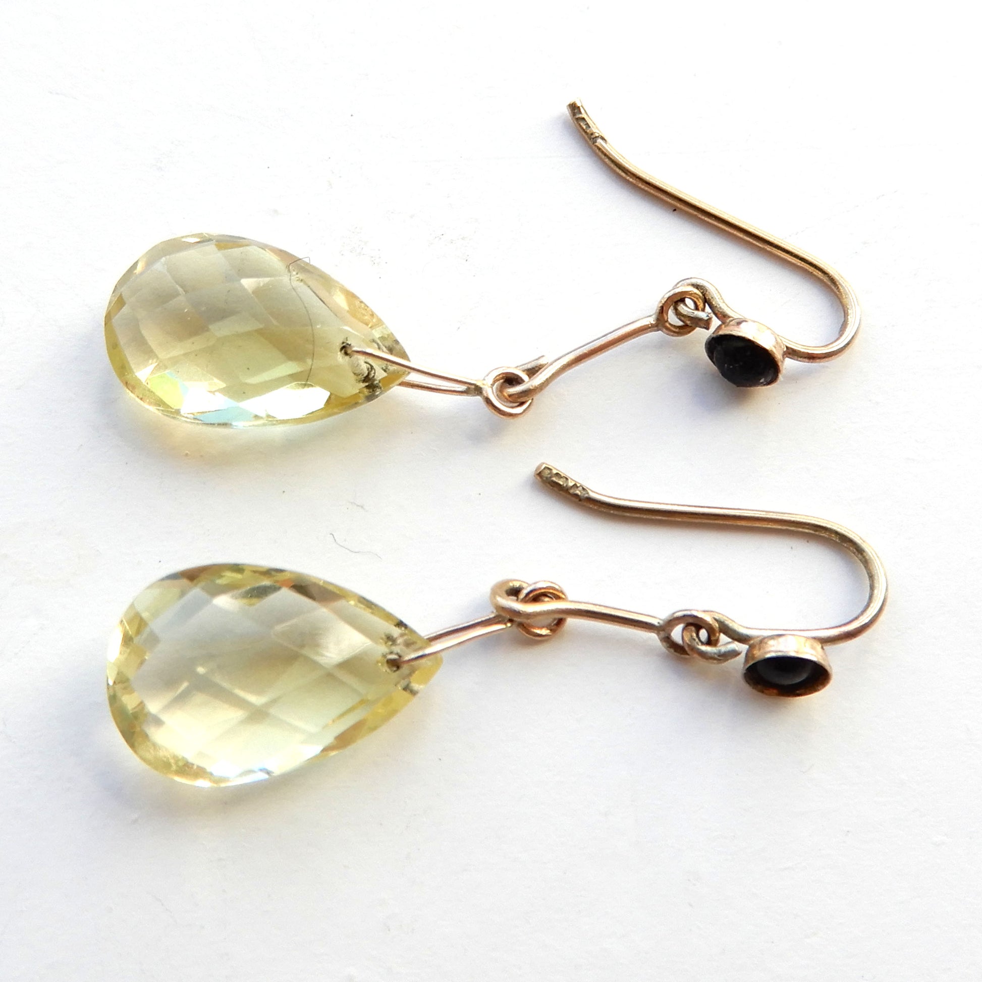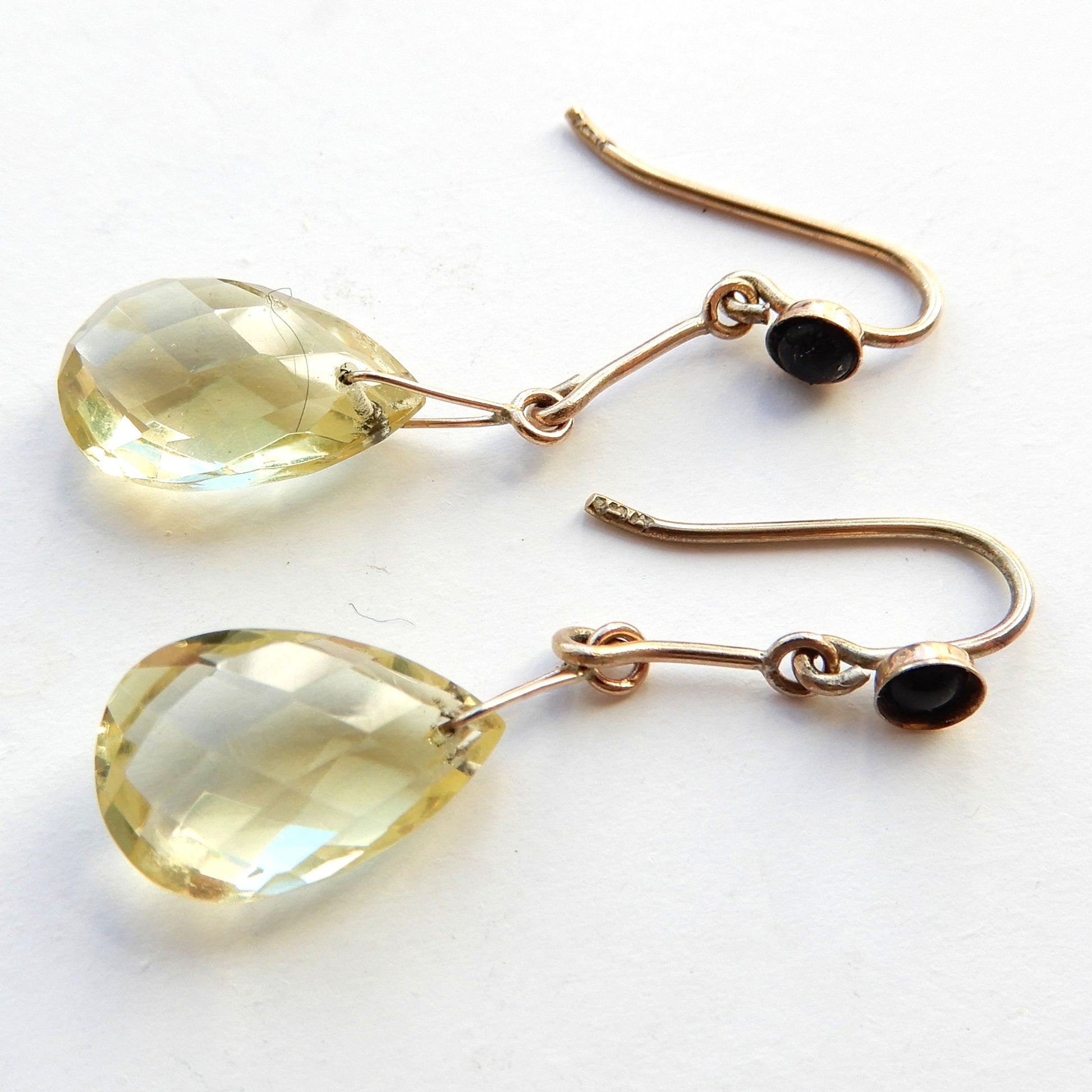 A unique pair of 9ct gold Citrine & Onyx drop earrings. The Citrine's both have geometric facets which look so elegant when they catch the light, these earrings add a touch of beautiful glamour to your outfit. When the light floods through the Citrines it really showcases their sublime pale hued green color. The earrings have 9ct gold hooks with an onyx cabochon to the top.