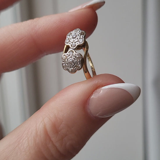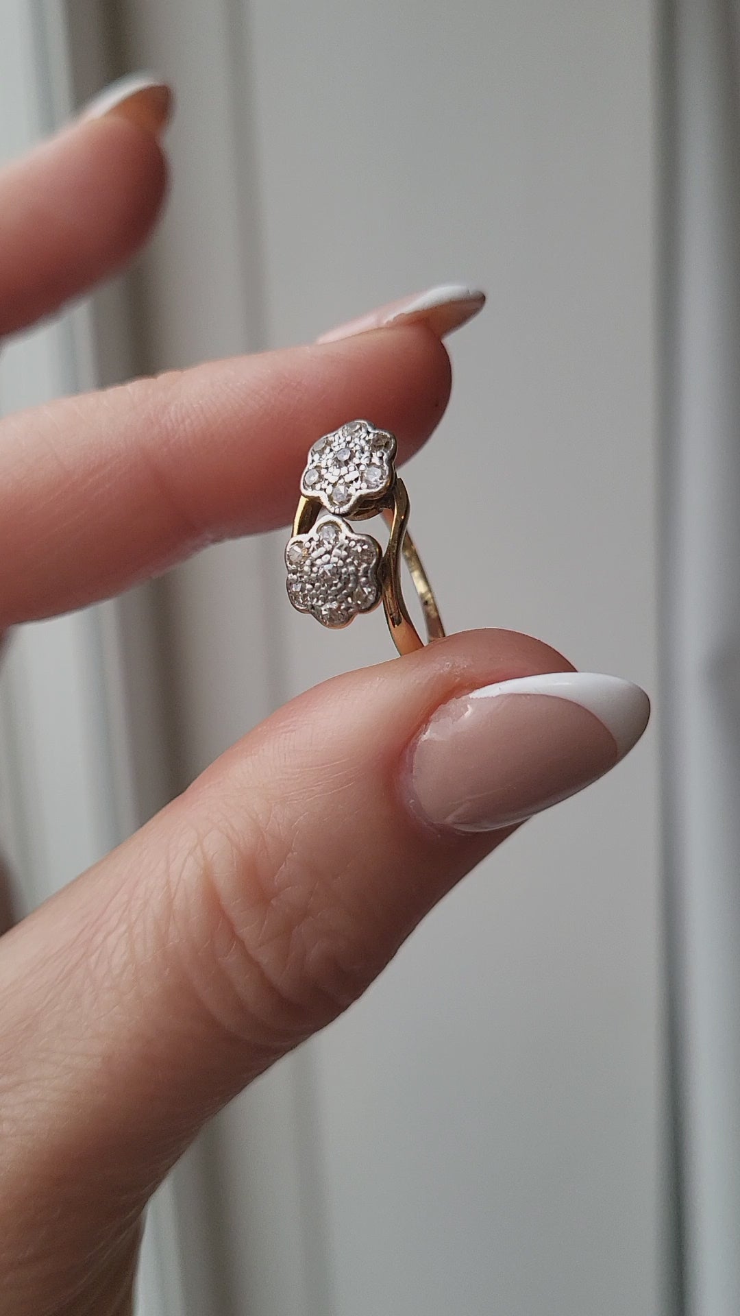 An enchanting Art Deco 18ct gold diamond cluster Toi et Moi ring, a striking jewel from one of the most decadent era.