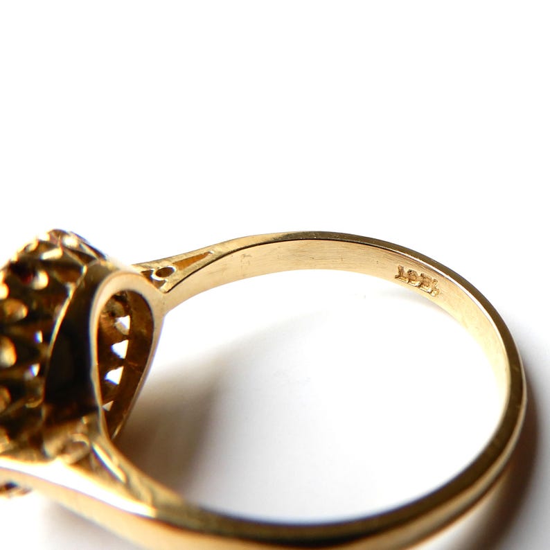 Antique 18ct Gold Multi-Gem Cluster Ring – Bloodstone, Diamond, Opal & Garnet — a truly unusual combination I haven’t come across before. The central bloodstone is surrounded by a halo of sparkling diamonds, garnets, and opals, all of exceptional quality. A remarkable and eye-catching cluster ring that stands out for its originality and vibrant mix of stones.
