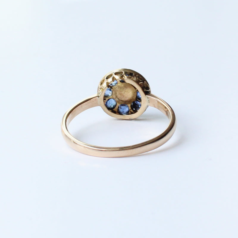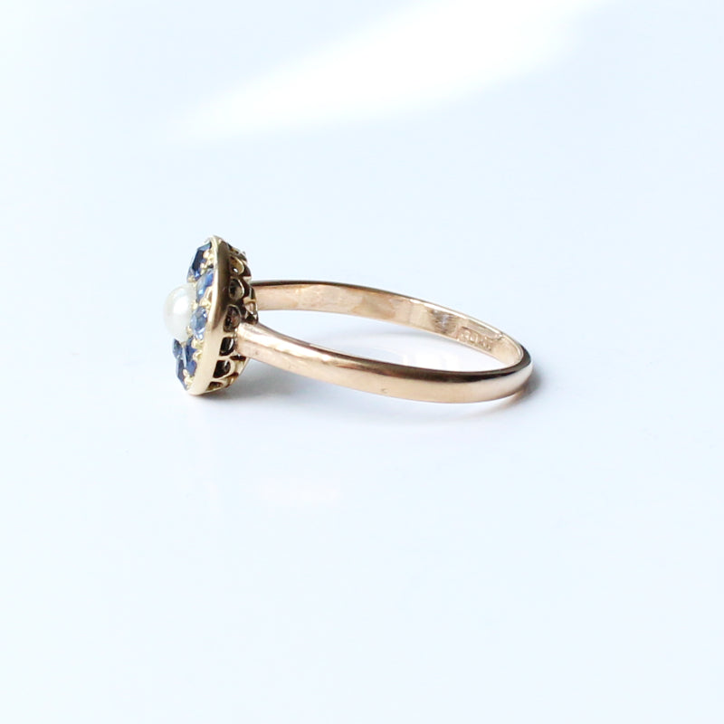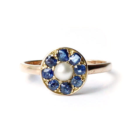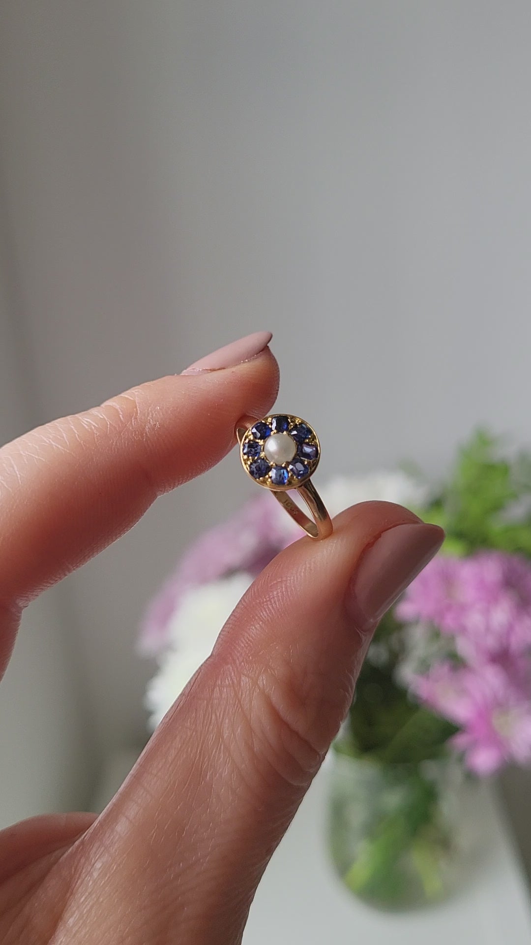 This sweet antique ring is such a beauty to behold. Crafted in rich 18ct gold featuring a delightful central Seed Pearl with an opulent halo of Cornflower Blue Sapphires. We suspect that this ring started out life as an Edwardian stick pin which has been converted into a ring at a later date. This is a very sweet & unusual antique ring which slips so beautifully onto the finger.