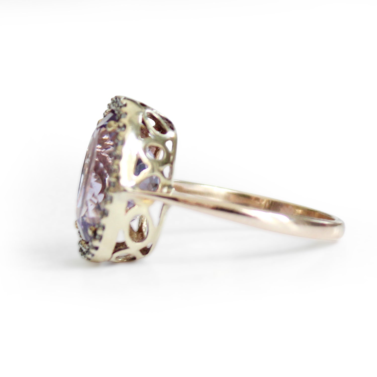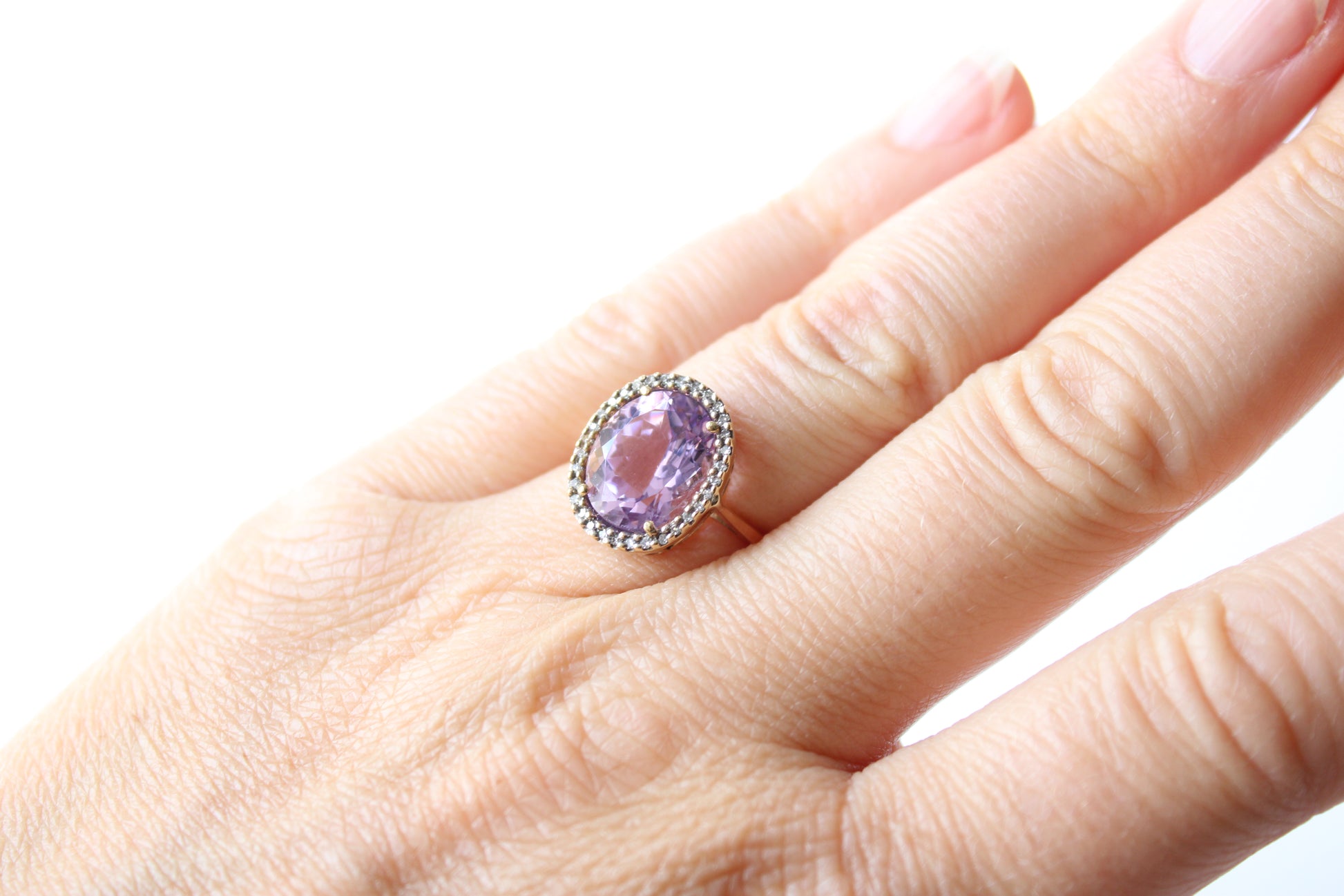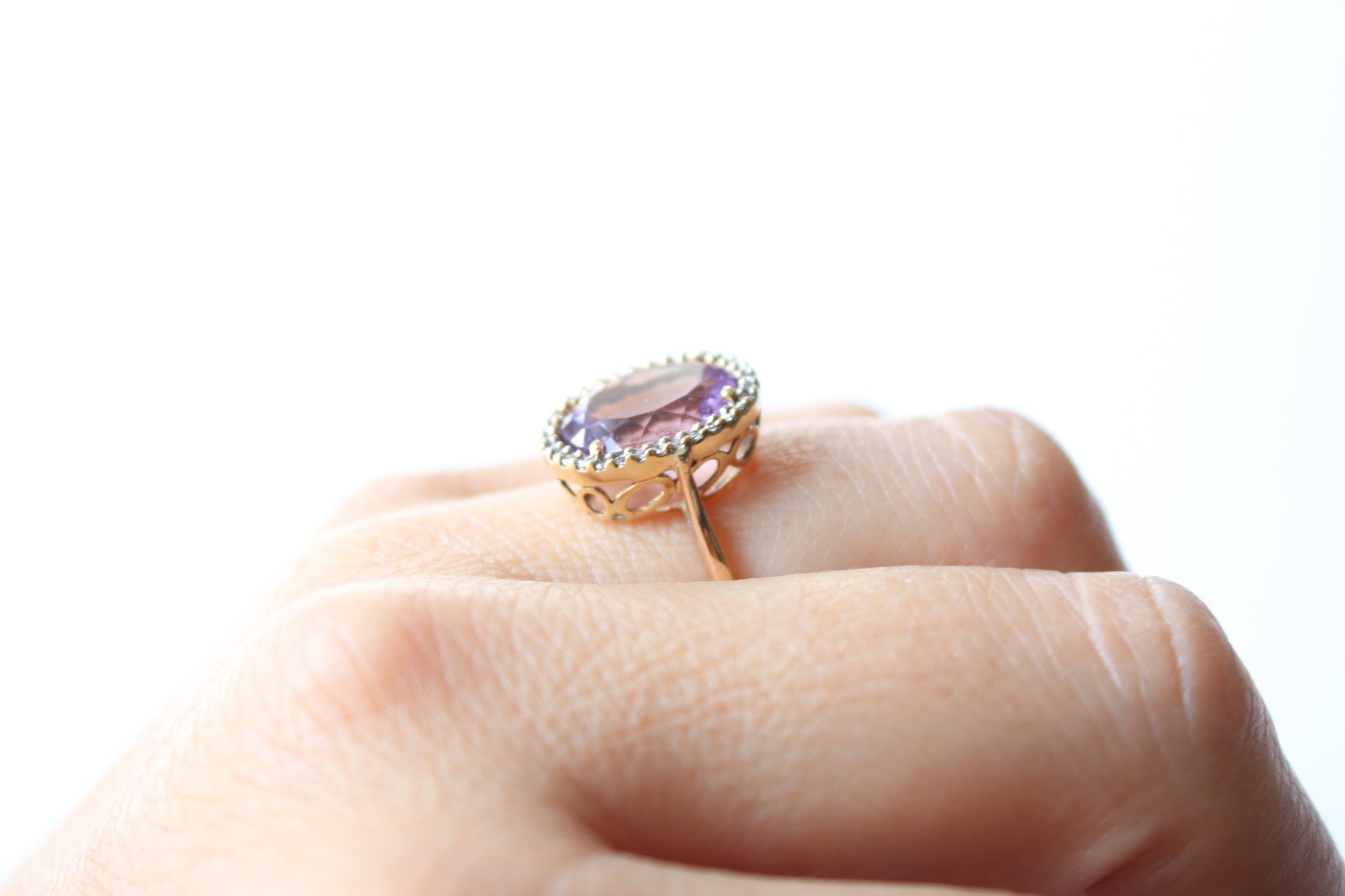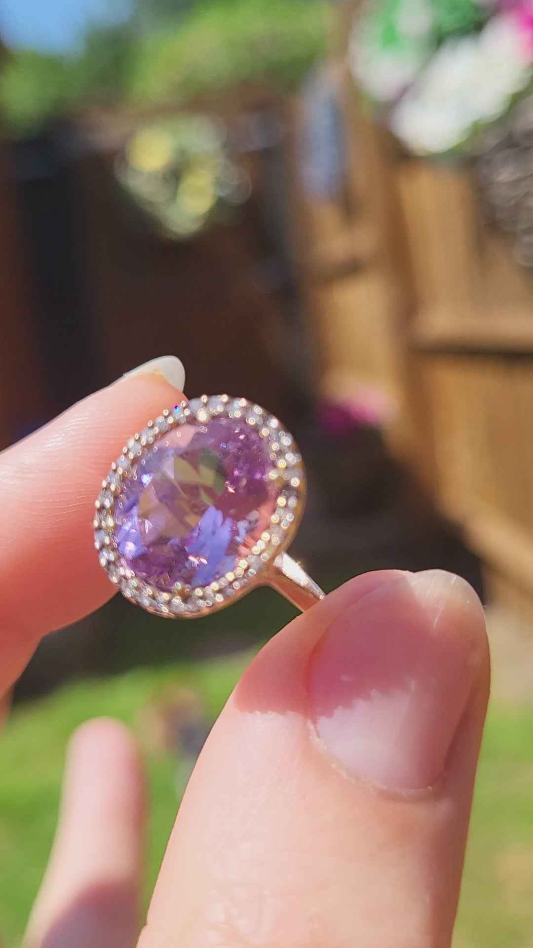 Crafted in 9 carat gold, the ring centres on flawless oval Amethyst, beautifully faceted to reflect light with brilliance and depth. Framing the gemstone is a single halo of sparkling diamonds.