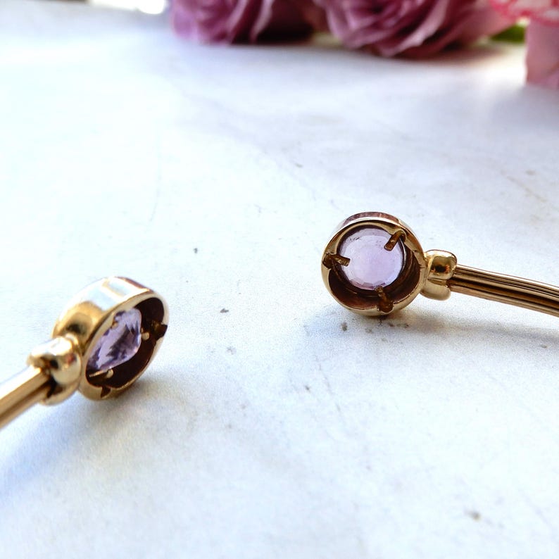 A beautiful antique open cuff bangle crafted in warm 9ct gold and set with two rich, bezel-set amethysts . The saturated purple hue adds a touch of decadence to any wrist — timeless yet versatile, this piece looks especially gorgeous layered in a bracelet stack or worn solo for a subtle statement