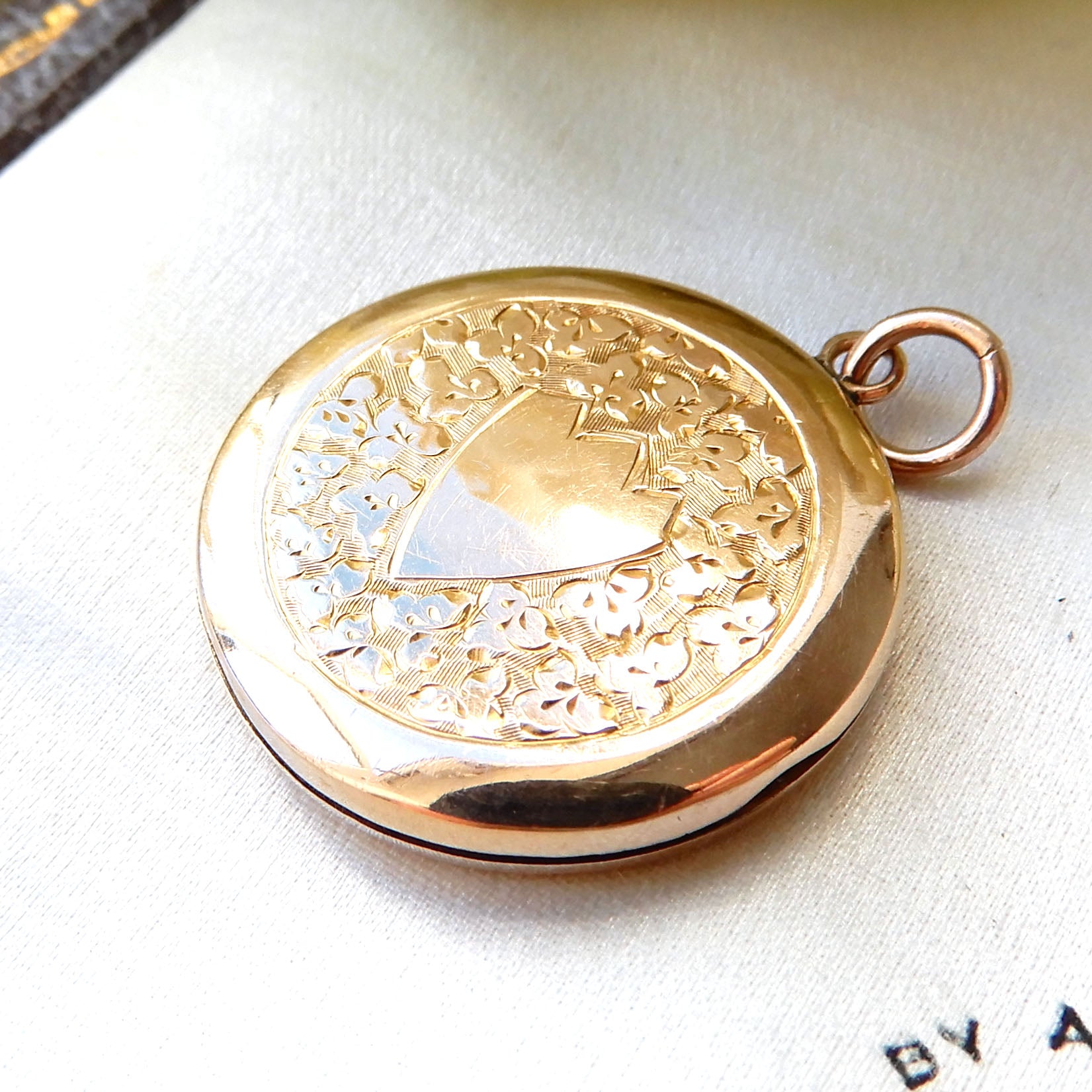 An exquisite antique 9ct gold locket, featuring delicate hand-chasing on both the front and back. The front includes a blank shield cartouche, perfect for personal engraving or leaving as a classic, elegant detail.