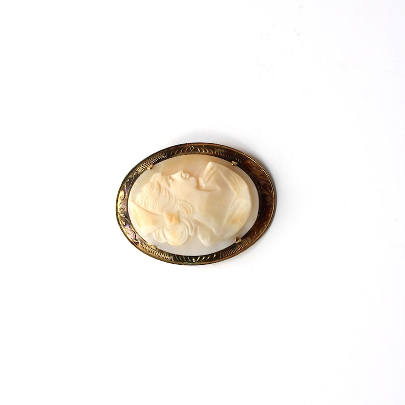 A timeless antique Cameo brooch. This beautiful hand carved cameo depicts the profile of an elegant lady. Set in a luxurious rolled gold frame. A magical Antique Cameo!