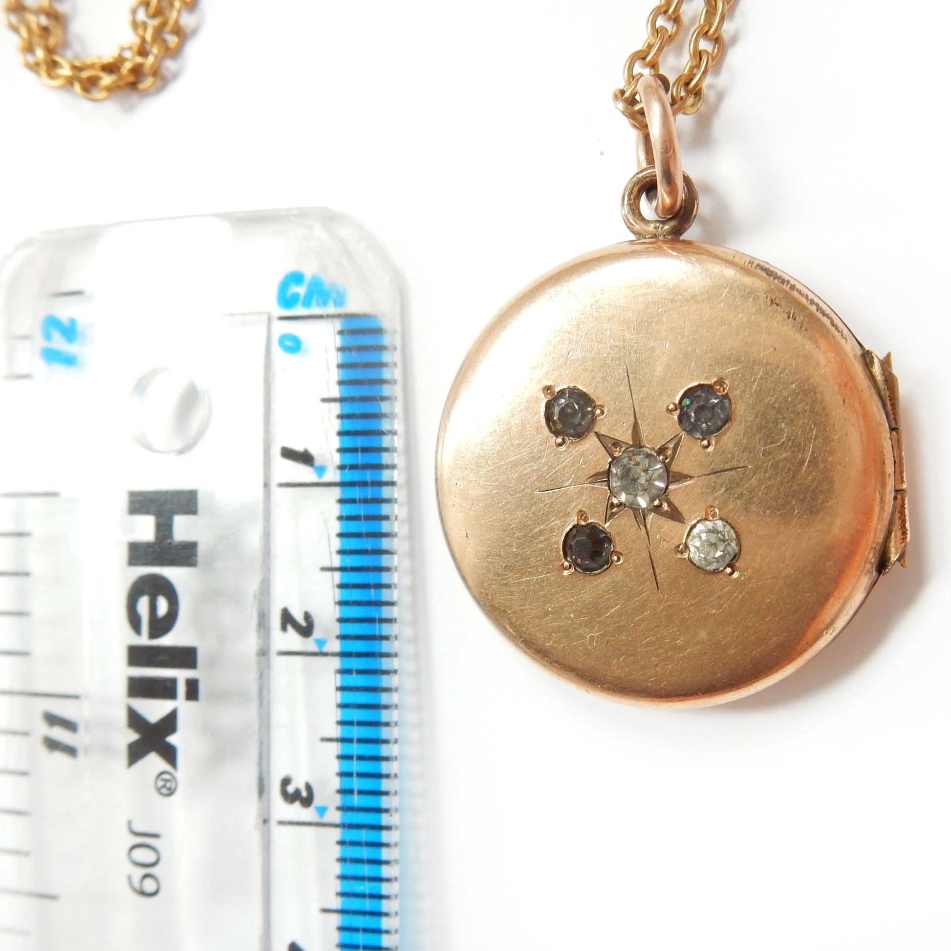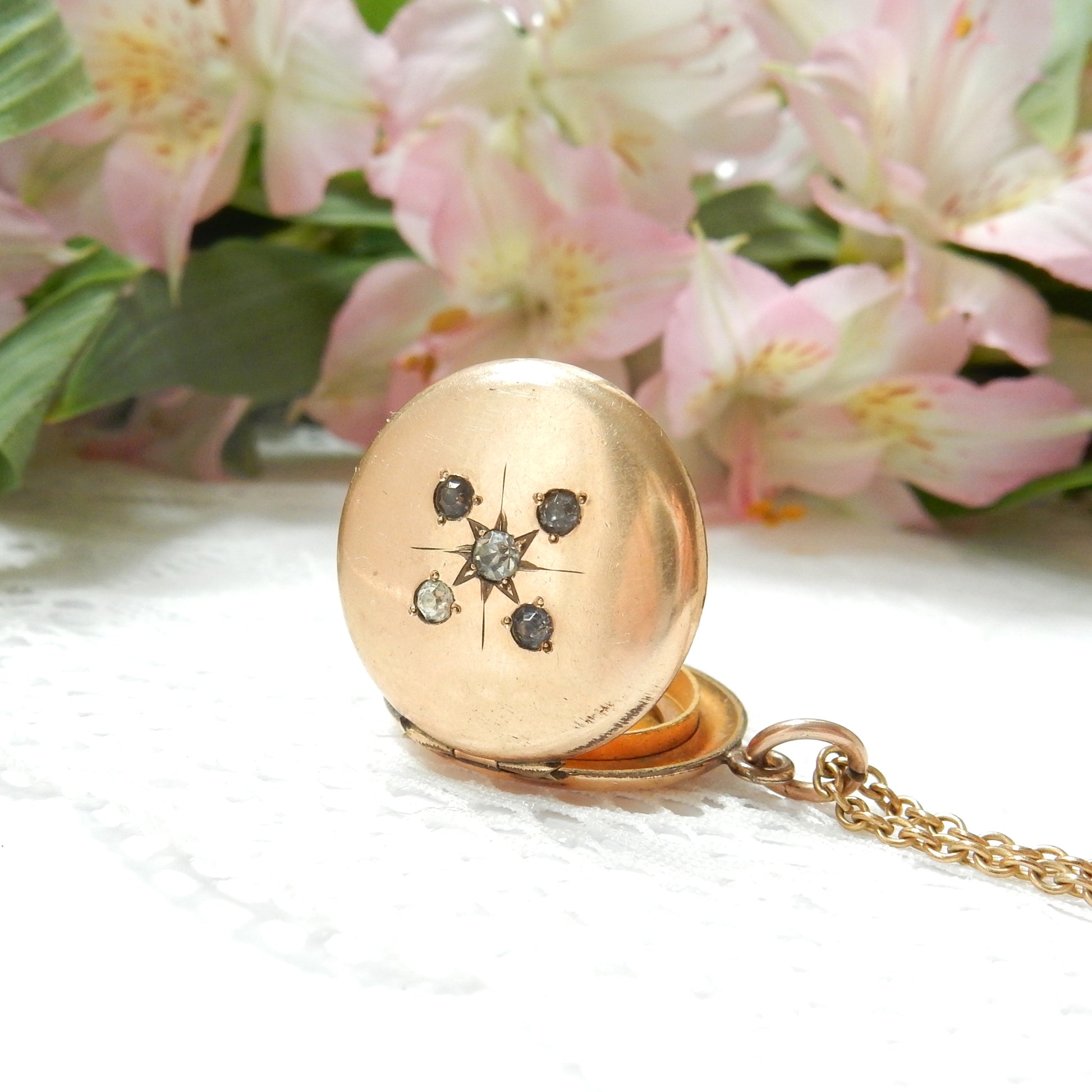 An incredible antique rolled gold photo locket. This beautiful circle shaped gold filled locket has an elegant etched star motif to the front with five Diamond paste stone accents; three of the paste stones have some discoloration. This locket comes with a vintage goldplated chain that has been added by us. This is a beautiful celestial vintage locket waiting to be treasured & loved. This locket would be perfect for storing a photograph of a loved one inside. A beautiful true vintage gold filled Locket!