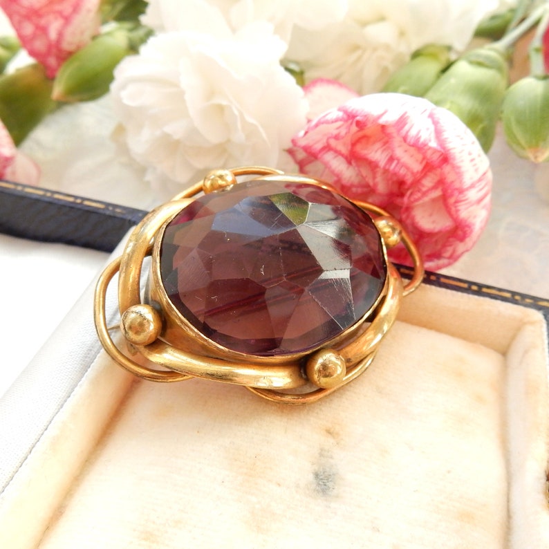 A breath taking antique goldplated brooch. This amazing brooch has so much going for it. The gold colored metal has an intricate interwoven border with four beads. The center of the brooch has a delightful rich purple colored glass stone. The glass has been facet cut giving it a real shimmer and sparkle when it catches the light! This is a beautiful collector's time piece which would look amazing pinned to a jumper or coat. A stunning 1900s era Amethyst Glass brooch!