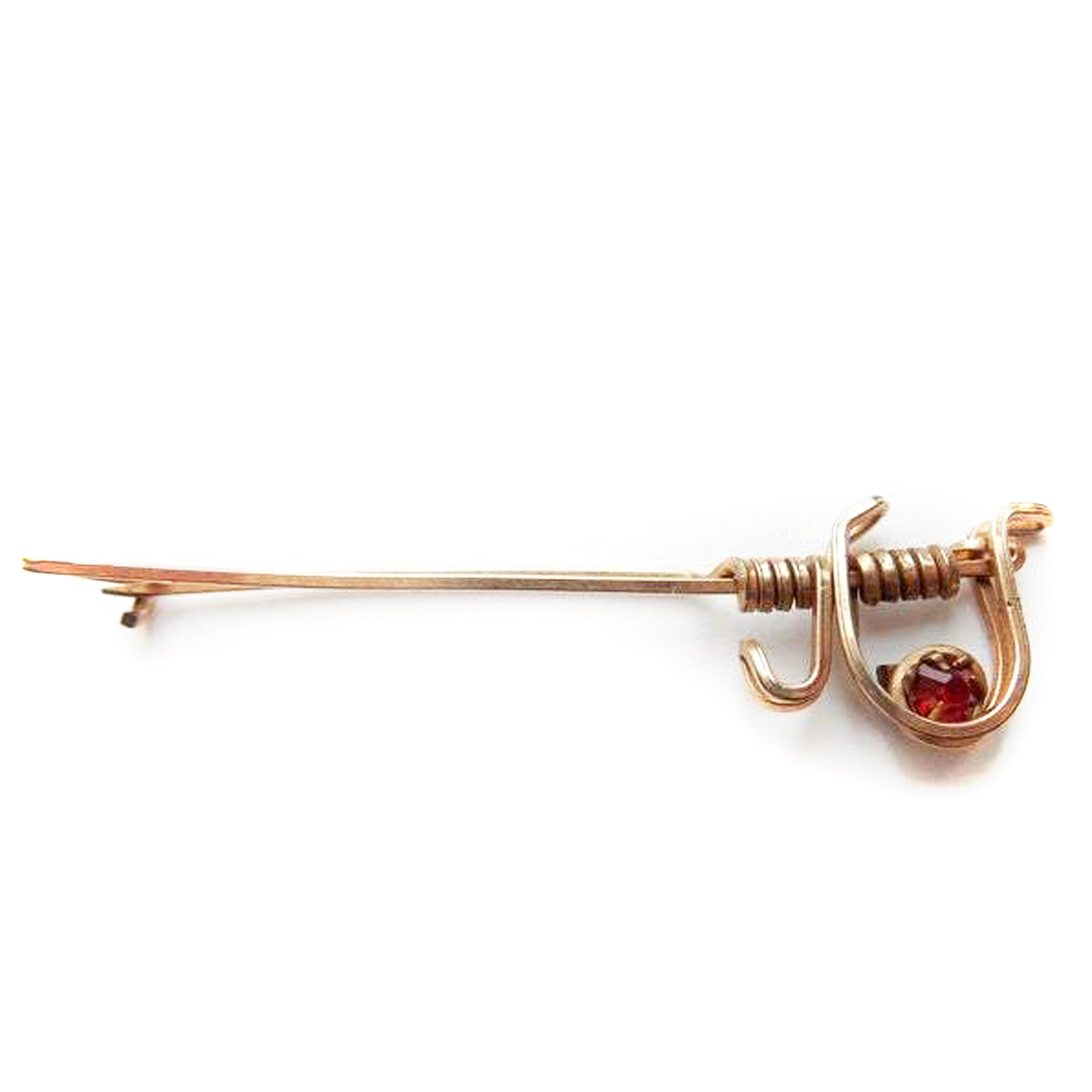 A unique antique rolled gold jabot pin brooch. This beautiful brooch is in the shape of a sword, with a red paste stone accent. This is a very beautiful vintage Brooch waiting to be treasured, the perfect pin for a brooch collector. An incredible true vintage brooch!