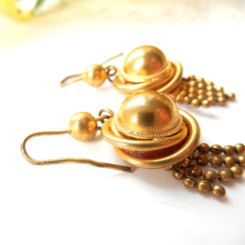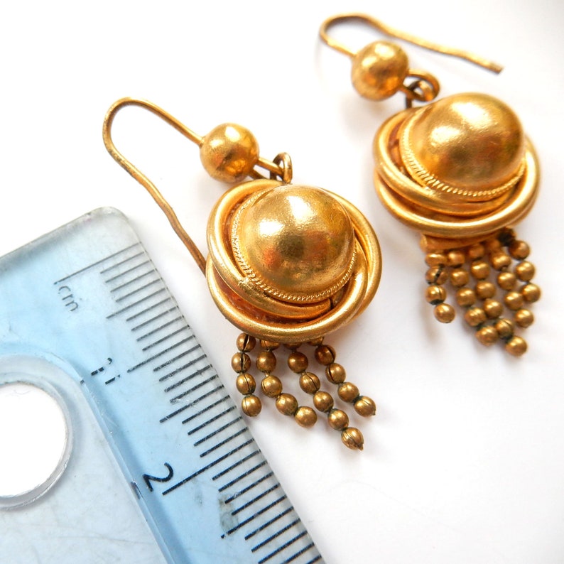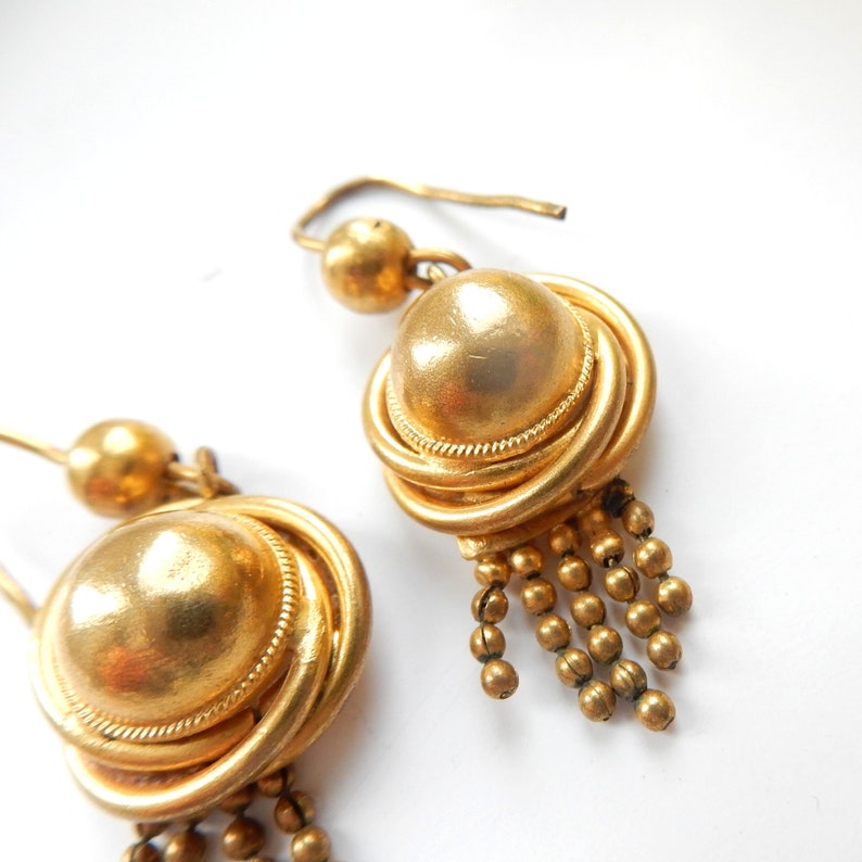 A stunning pair of Victorian pinchbeck drop earrings. These are a stylish pair of Victorian earrings still very much in vogue today. These earrings have a beautiful rich yellow gold tone with amazing beaded drops to the bottom of each earring. Please note that one of the beaded drops is missing; this has been photographed; but these earrings do still have plenty more years of wear and enjoyment left! An incredibly rare pair of Victorian droplet earrings!