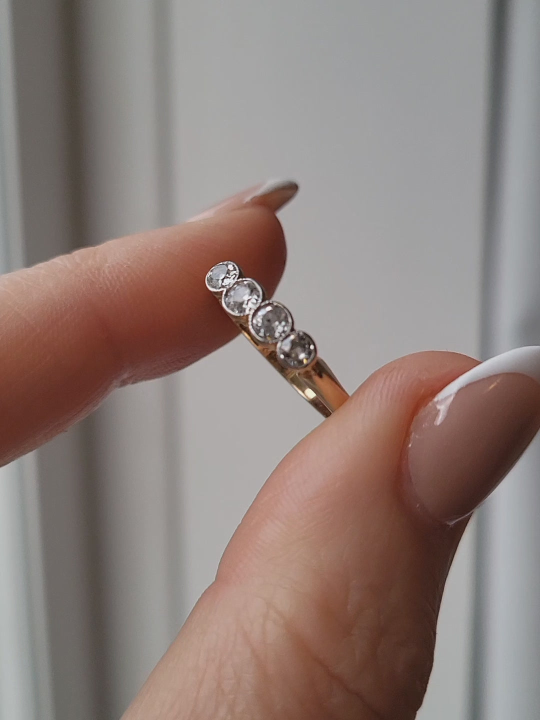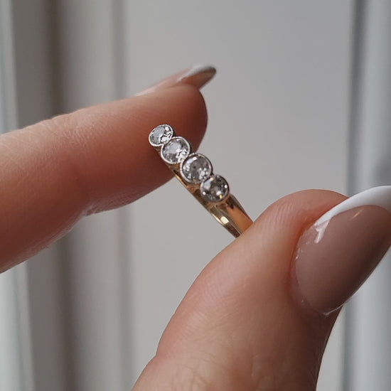 An exceptional antique 18ct gold Diamond four stone ring. Set in a sleek 18ct band with four bright, clean diamonds bezel set into a platinum top. A classic beauty which would make a beautiful engagement ring.