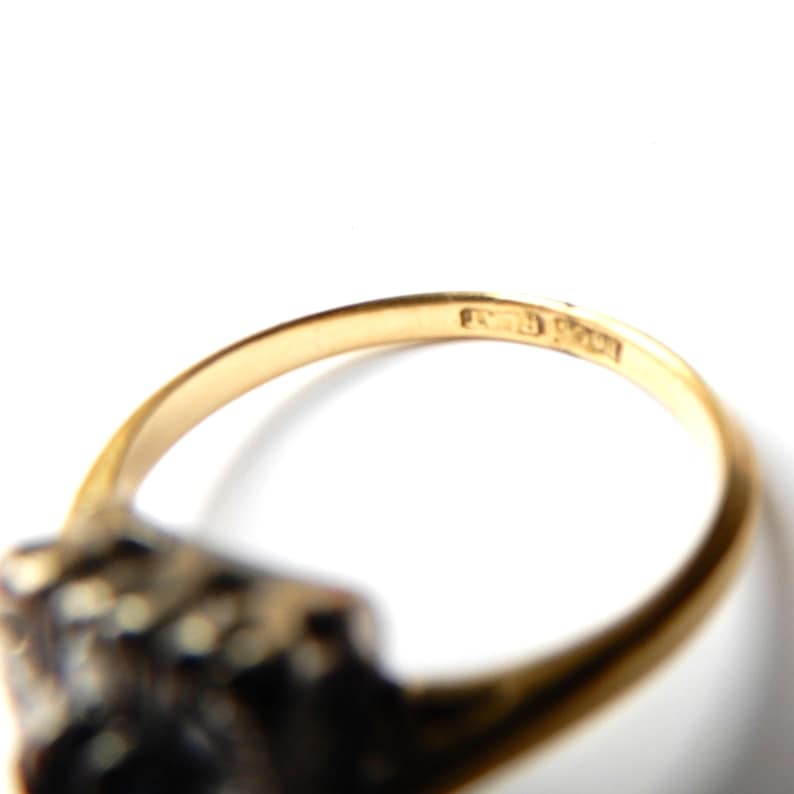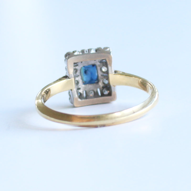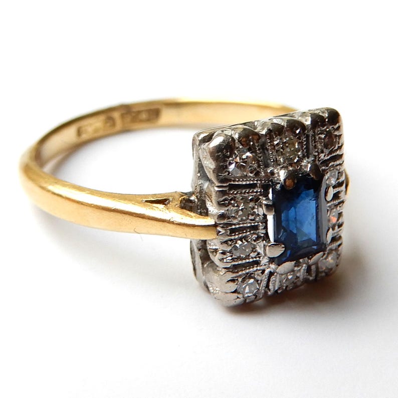 Art Deco 18ct Gold Sapphire & Diamond Ring — a lovely square-shaped plaque set with ten sparkling diamonds surrounding a central sapphire. Please note there are some surface abrasions on the sapphire. A wonderful antique ring for those of you who have a penchant for all things Art Deco!