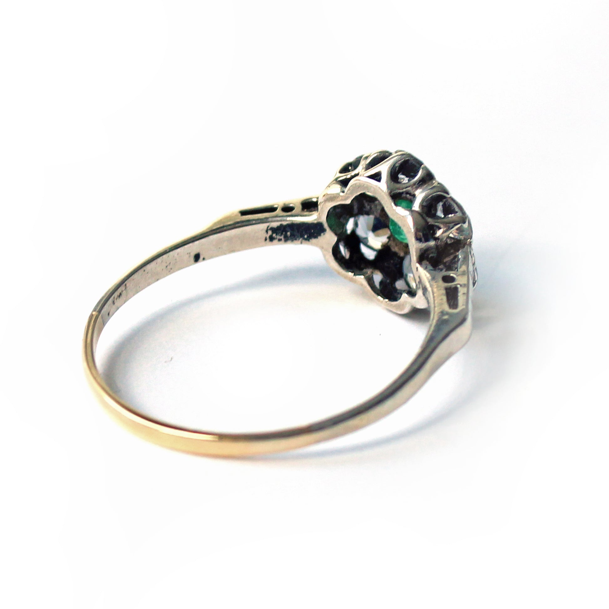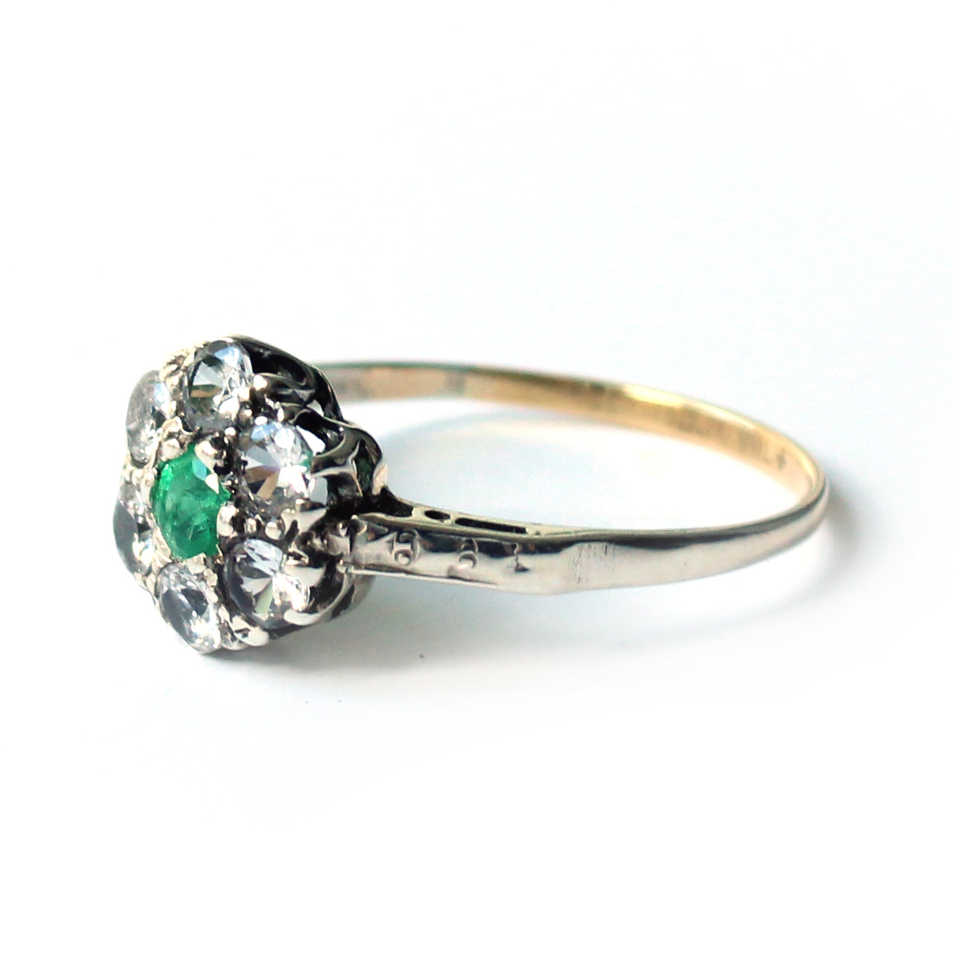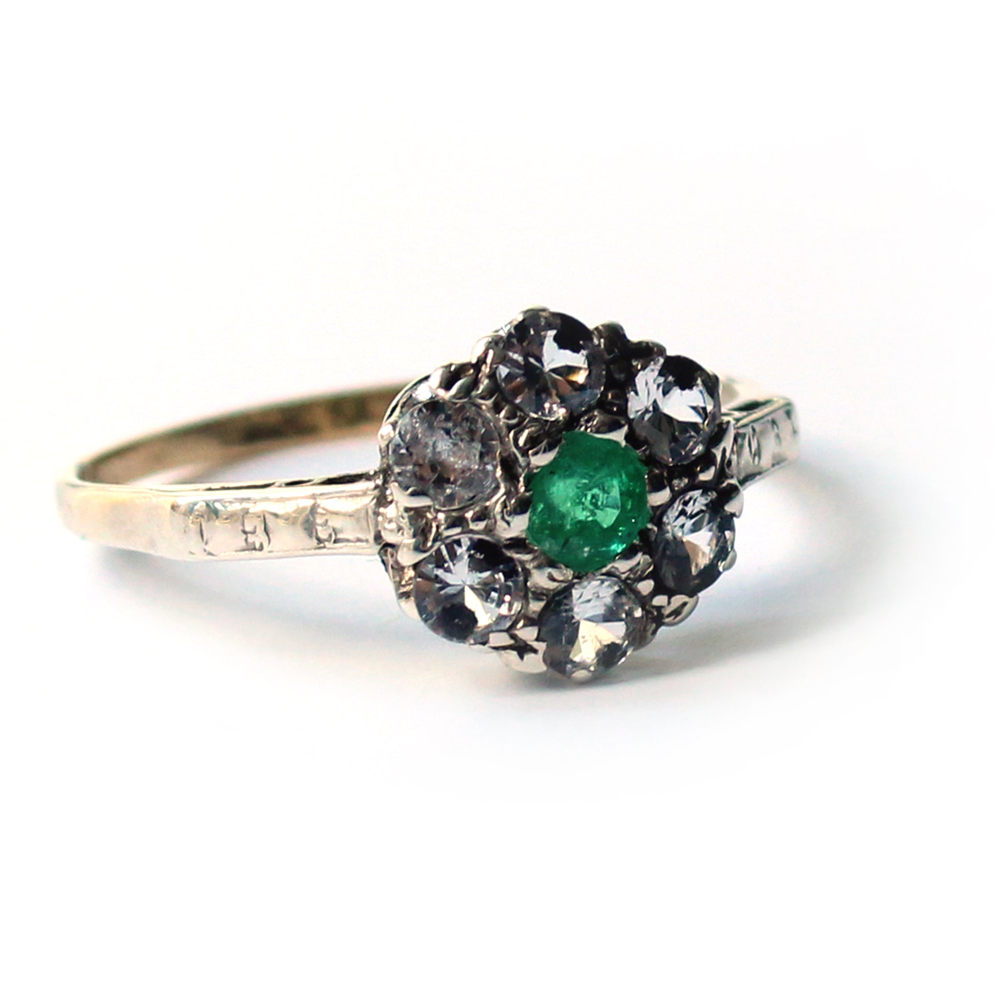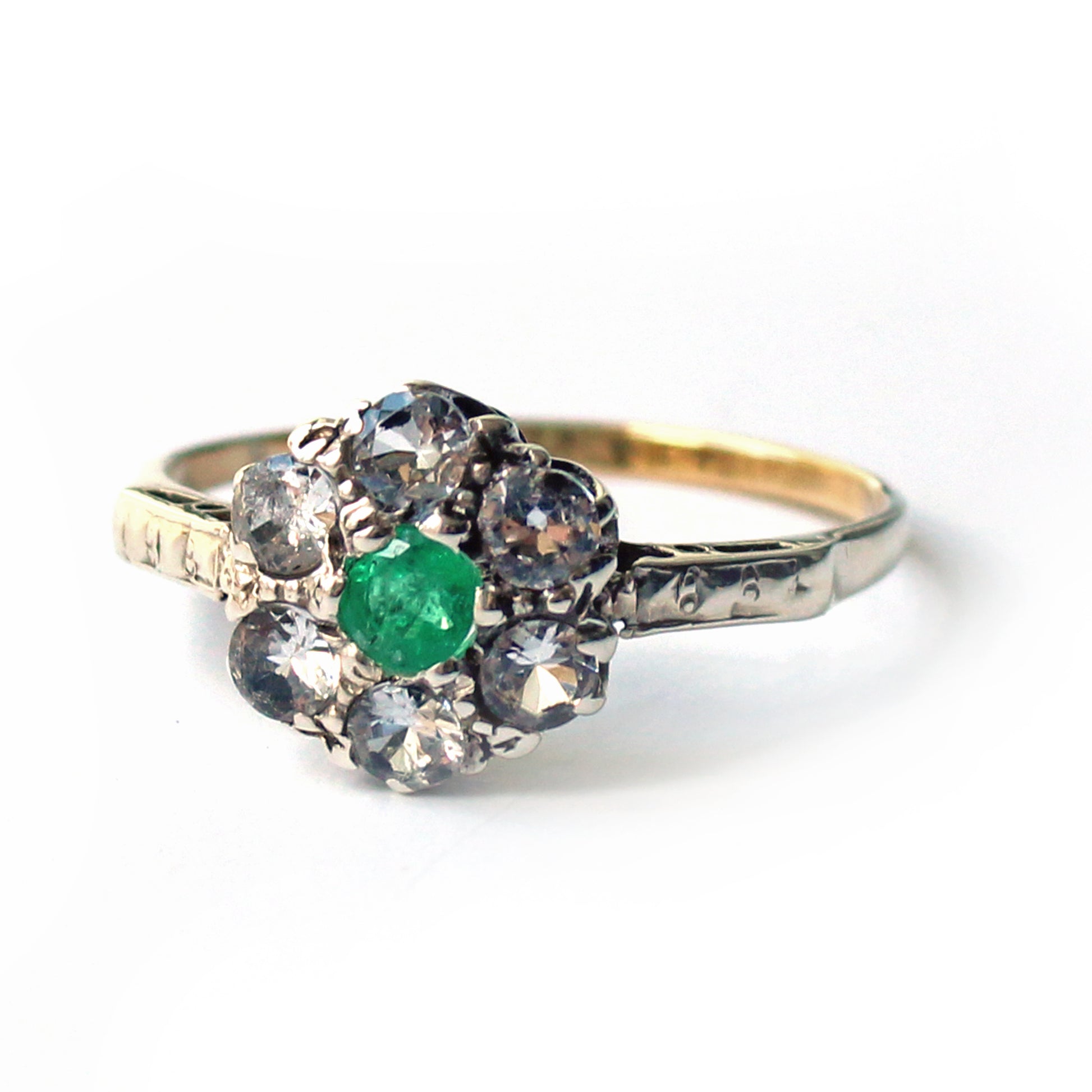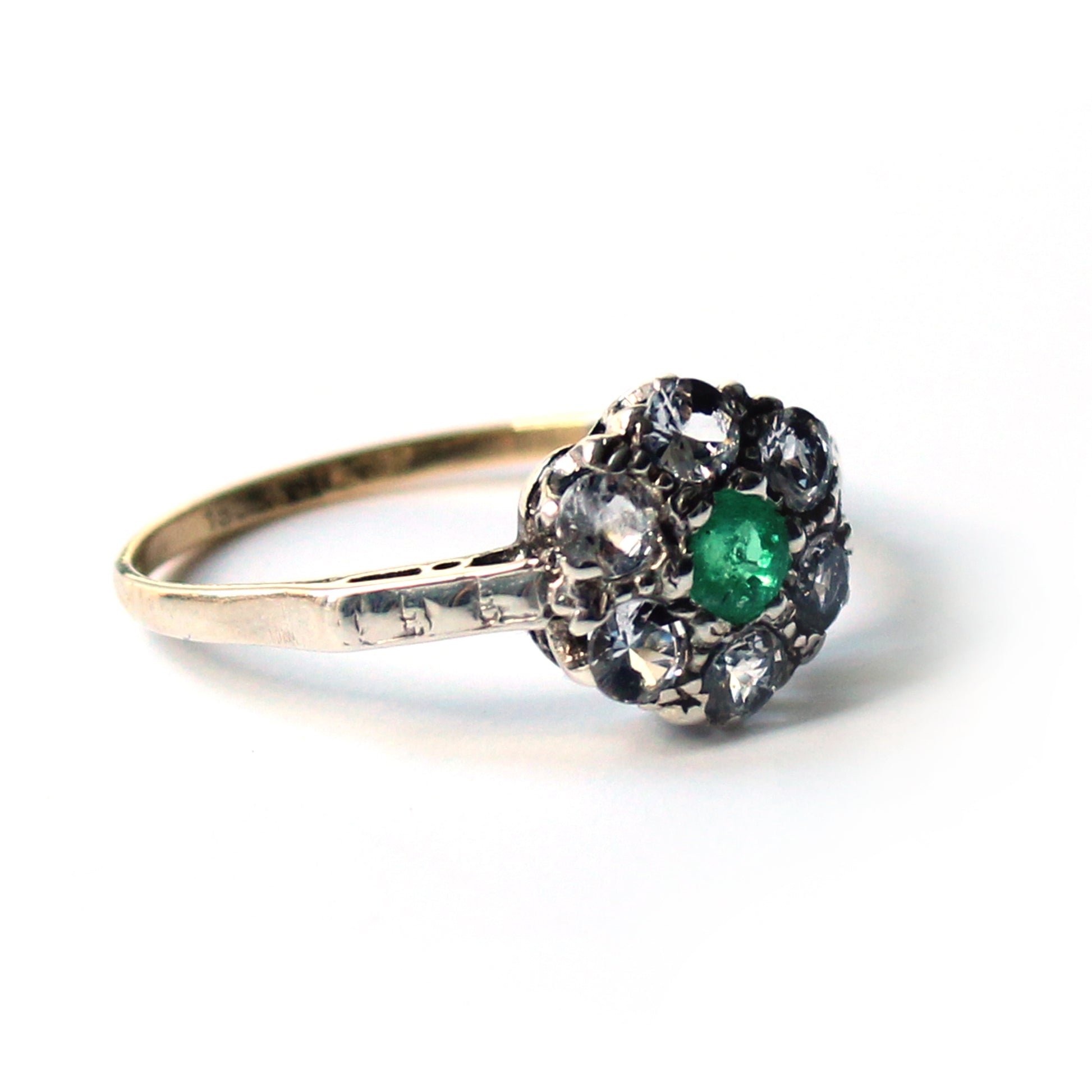 A striking Art Deco emerald cluster ring, designed in the shape of a delicate flower. At its centre sits a vibrant emerald, surrounded by six sparkling paste stone petals that create a soft, floral silhouette. The ring is crafted with an 18ct gold shank for a warm, luxurious feel, while the petal setting is made in silver, giving the top a gentle contrast and vintage charm. Elegant, romantic, and full of Deco-era character — a beautiful blend of colour, texture, and timeless style.