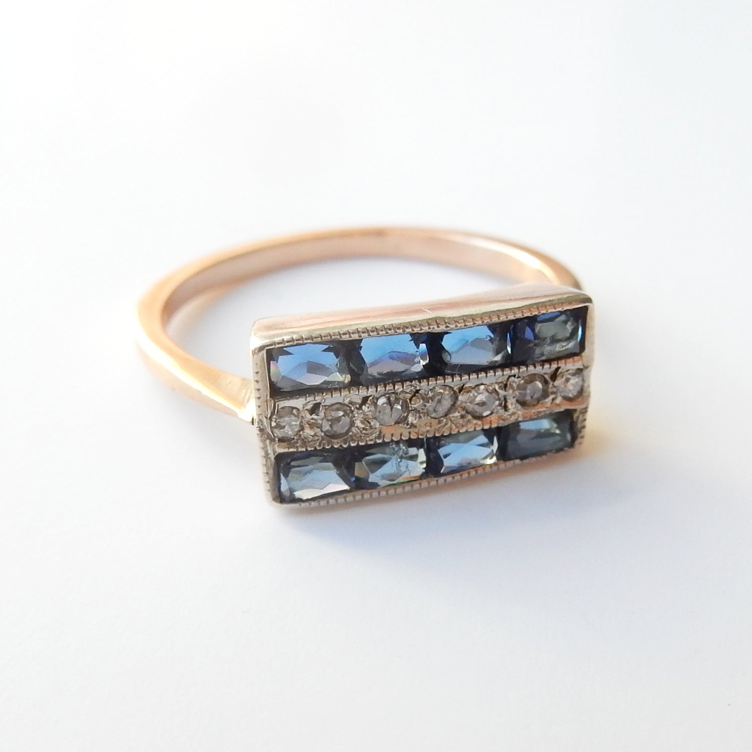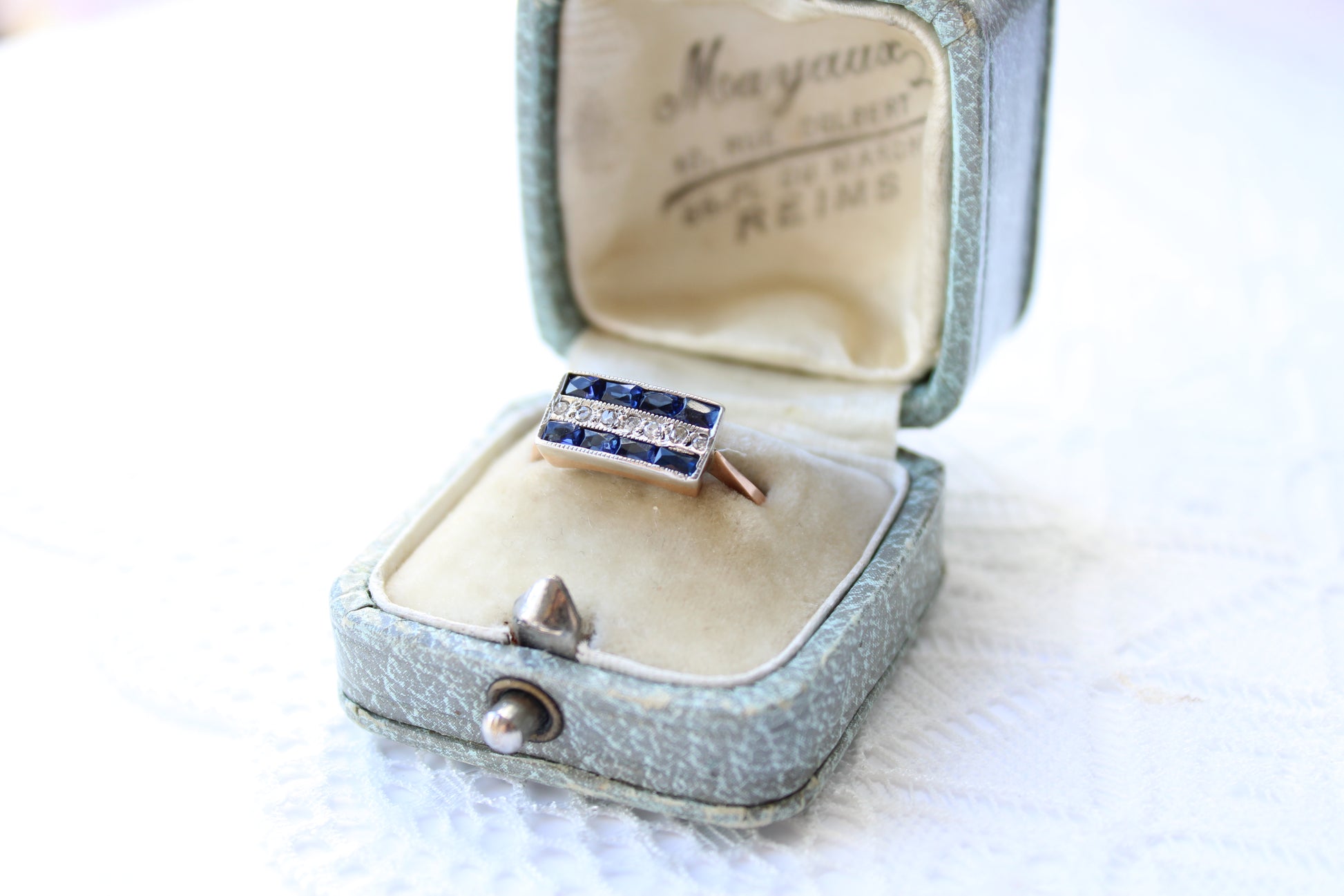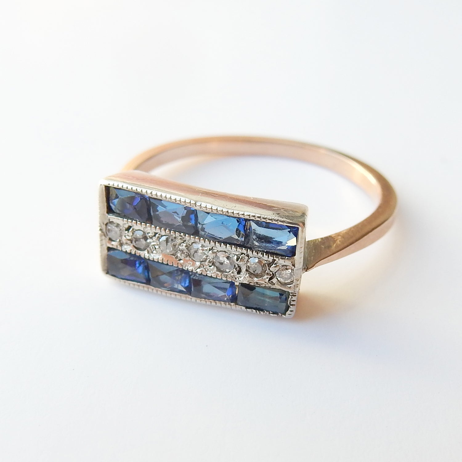 A luxurious all original Art Deco ring. Modelled in 9ct Gold; this antique ring has a beautiful streamlined design which showcases two channels of Calibre cut Sapphires and a row of old cut Diamonds running down the centre. This ring has been created with precision and care; the bezel setting of this ring has a platinum top with a fine Millegrain edging which adds the perfect textured look. The Art Deco movement emerged, bringing forth a wave of geometric shapes, bold colours, and sleek lines that defined the era's aesthetic and this ring captures just that. This ring is a dream to wear, just waiting to be enjoyed for many more years to come!