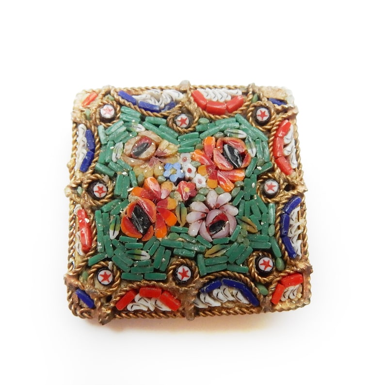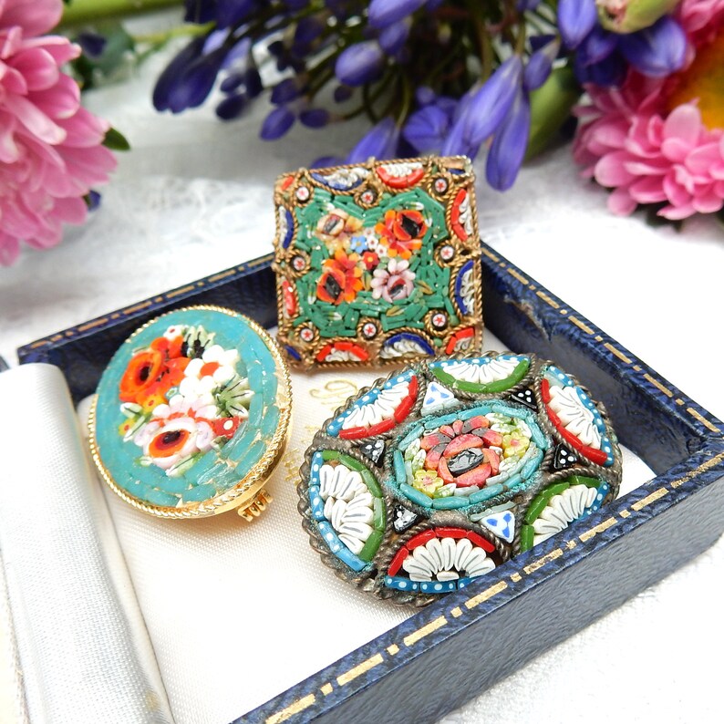 A wonderful opportunity to acquire a beautiful collection of 3 Italian made Micro Mosaic brooches. Please do note that one of the brooches has a small piece of mosaic missing. Each brooch has been carefully crafted by hand featuring tiny mosaic glass pieces formed into a floral design. A gorgeous set of 3 brooches perfect for a collector!