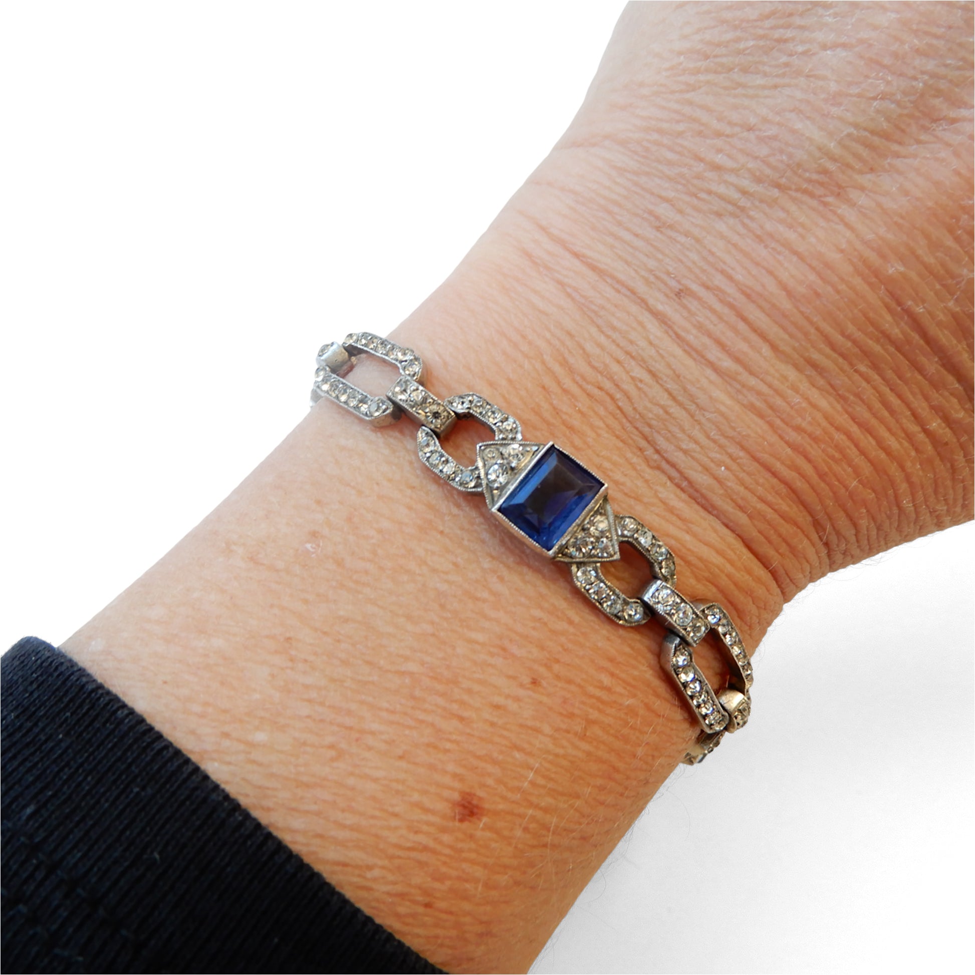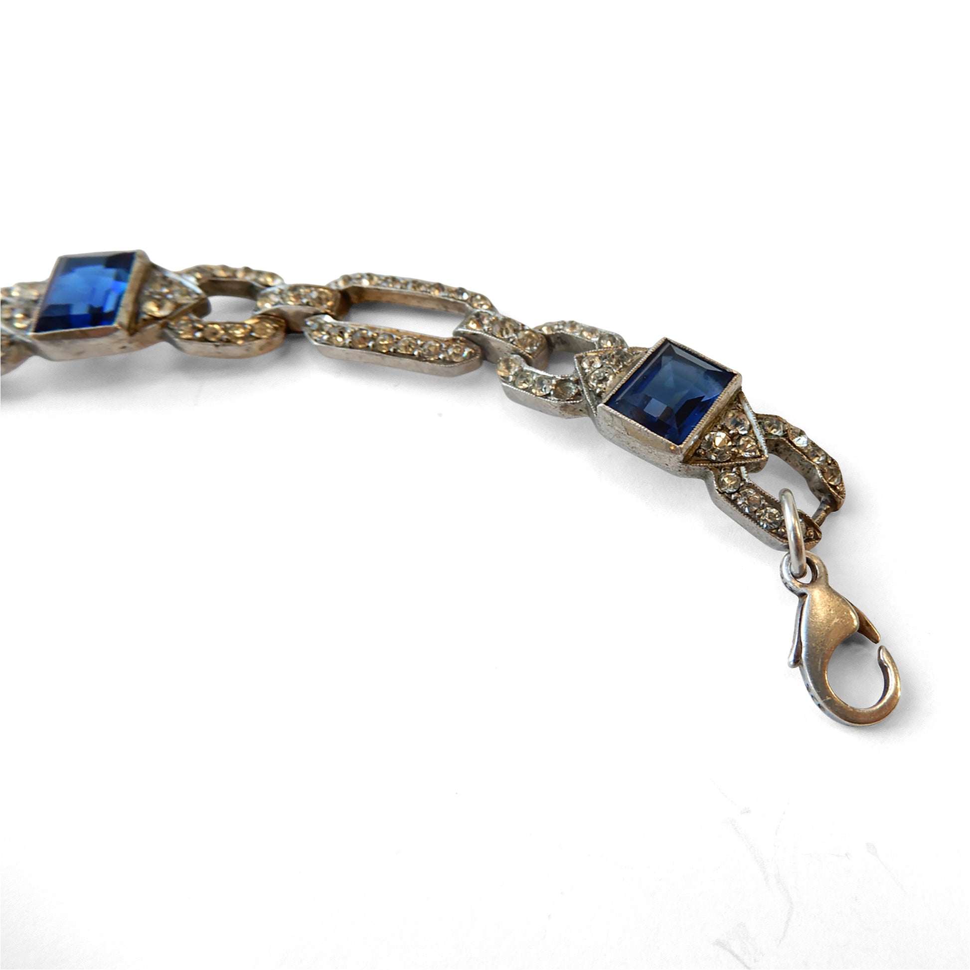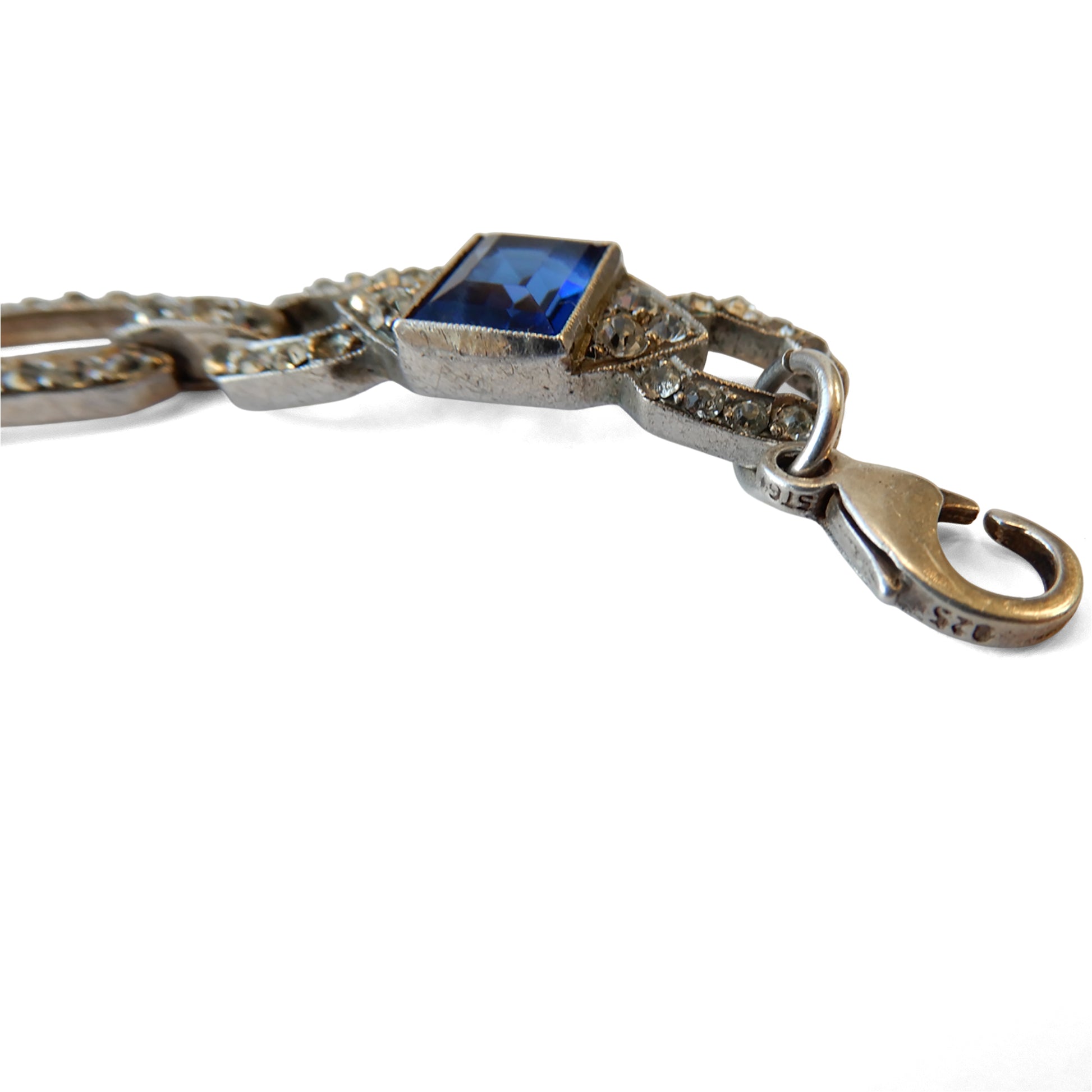 This is a beautiful vintage Art Deco style bracelet is crafted from sterling silver. The bracelet boasts a series of brilliant sapphire-colored paste stones, each set in intricate, open-back square settings that allow light to enhance their deep blue. These stones are interspersed with ornate links, meticulously designed in elongated oval shapes and adorned with shimmering diamond-like paste accents. The delicate pavé-style detailing on the links creates a dazzling interplay of textures, enhancing the overall sparkle and charm of the piece. Finished with a secure lobster clasp.