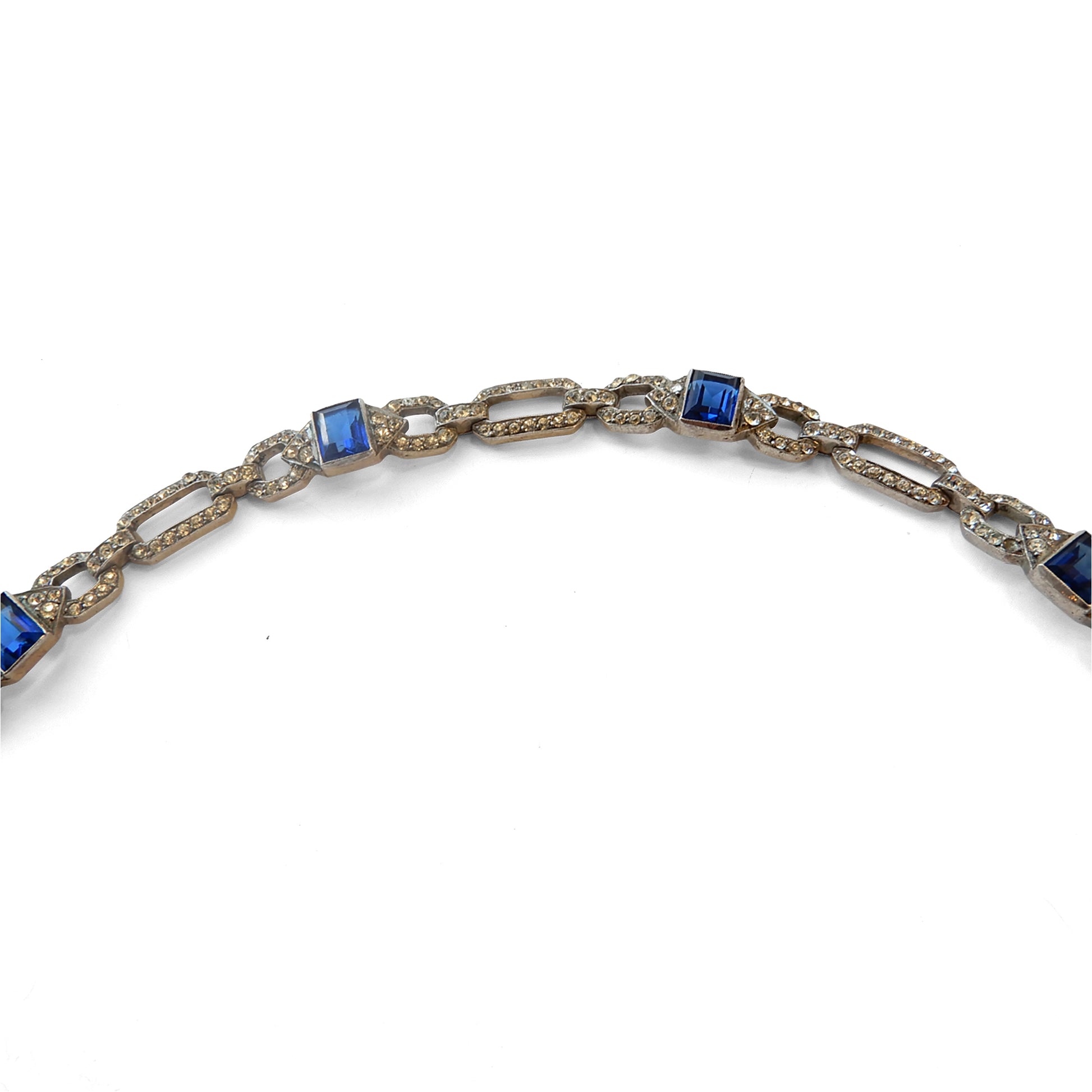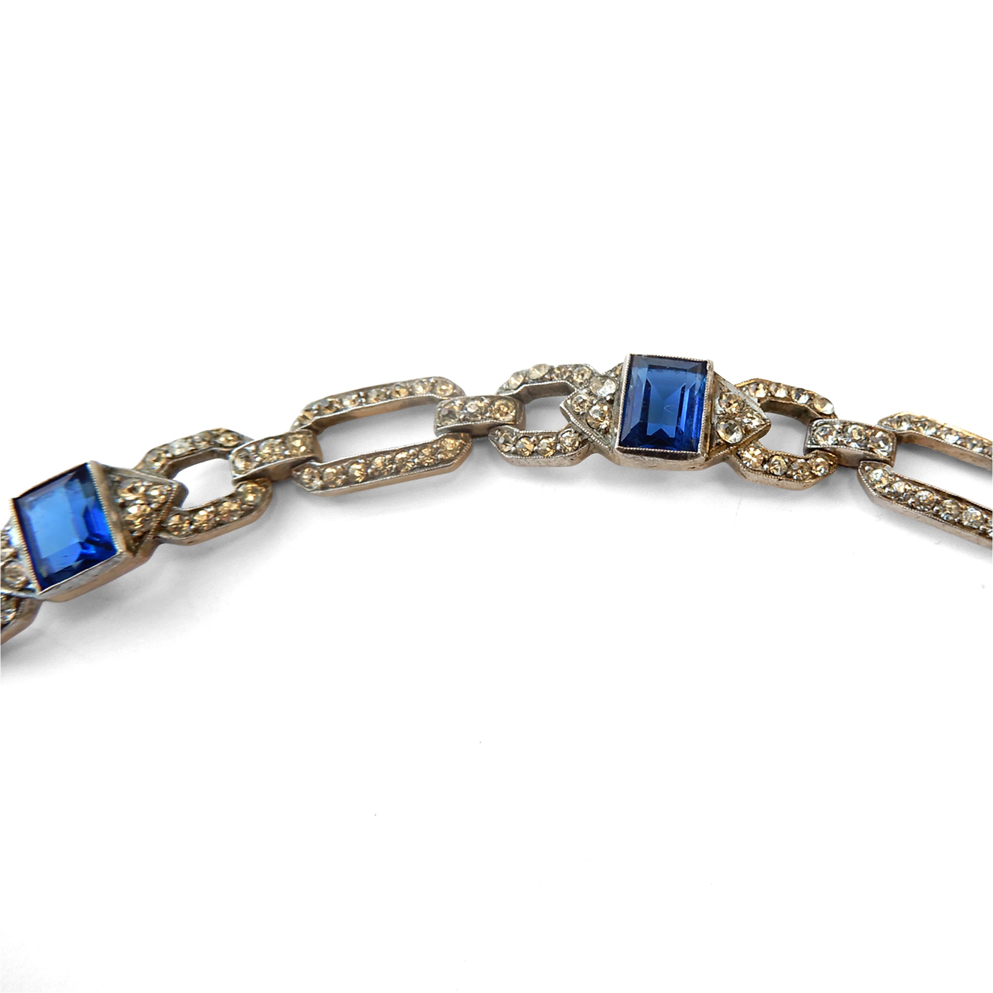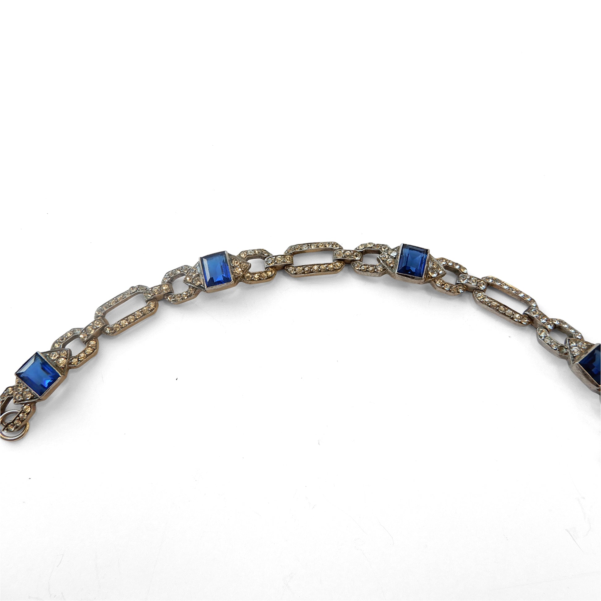 This is a beautiful vintage Art Deco style bracelet is crafted from sterling silver. The bracelet boasts a series of brilliant sapphire-colored paste stones, each set in intricate, open-back square settings that allow light to enhance their deep blue. These stones are interspersed with ornate links, meticulously designed in elongated oval shapes and adorned with shimmering diamond-like paste accents. The delicate pavé-style detailing on the links creates a dazzling interplay of textures, enhancing the overall sparkle and charm of the piece. Finished with a secure lobster clasp.