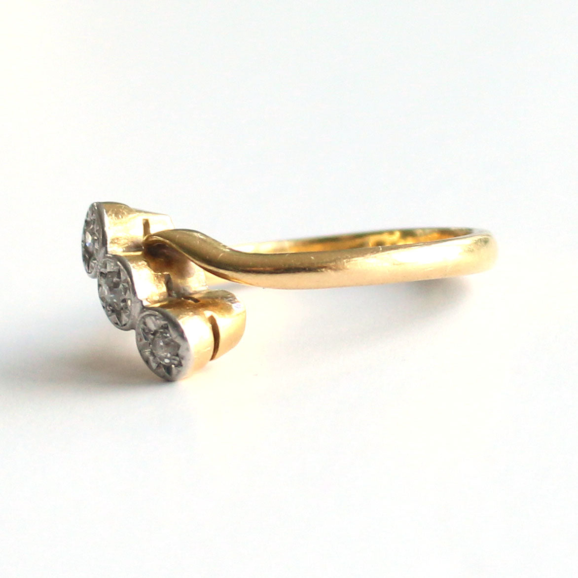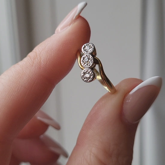 This Edwardian 18ct gold diamond trilogy ring is a charming example of early 20th-century craftsmanship. The three sparkling diamonds are set in a graceful bypass design, each nestled in a delicate punched-star platinum setting that adds intricate and unique detail. The combination of warm yellow gold, cool platinum accents, and the flowing bypass form gives this ring a refined, timeless elegance. Perfect as a romantic gift, a vintage engagement ring, or a treasured addition to any antique jewellery collection.