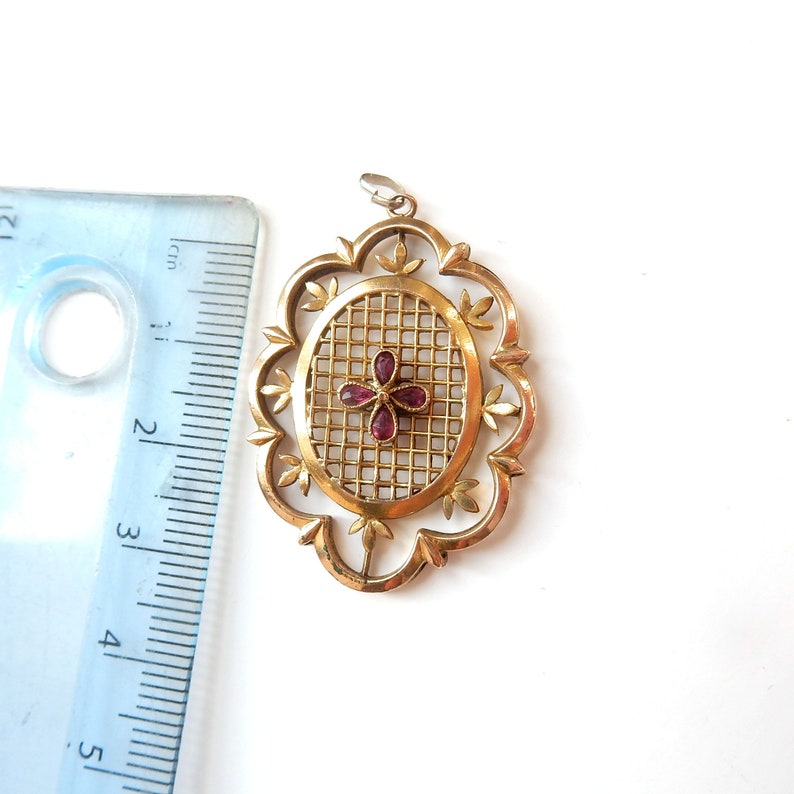 An incredibly beautiful Edwardian era rolled gold pendant. This oval shaped pendant has been beautifully crafted, with openwork detail to the metal and a central flower adorned with amethyst stones. This is a beautiful antique pendant waiting to be loved and cherished by her new caretaker. A unique finely crafted antique rolled gold pendant!