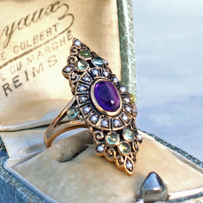 Edwardian style 9ct Gold Amethyst Peridot & Pearl Navette Ring