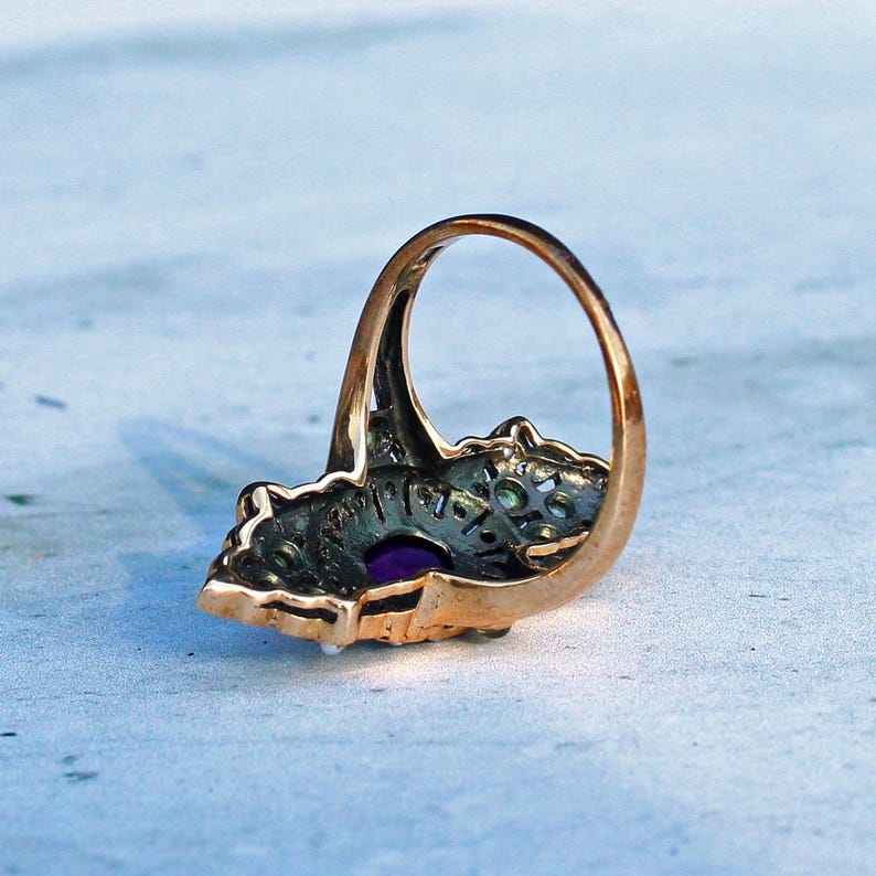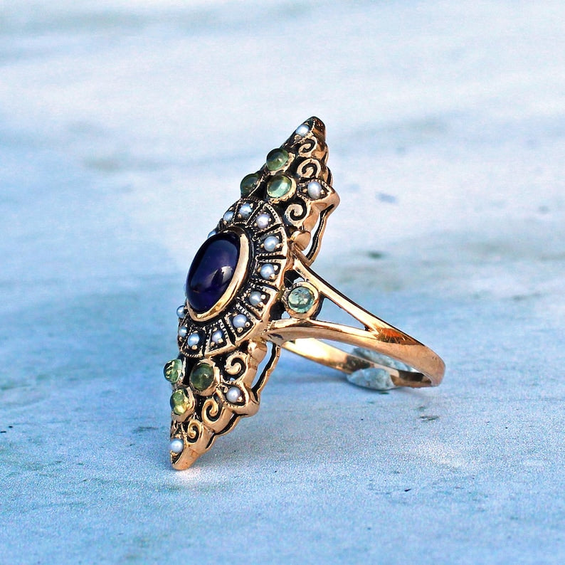 A striking Edwardian-style ring, crafted in 9ct gold and set with the iconic Suffragette colors – amethyst, peridot, and pearl. The navette-shaped design features a smooth amethyst cabochon at its heart, surrounded by glimmers of luminous pearls and vibrant peridot accents.