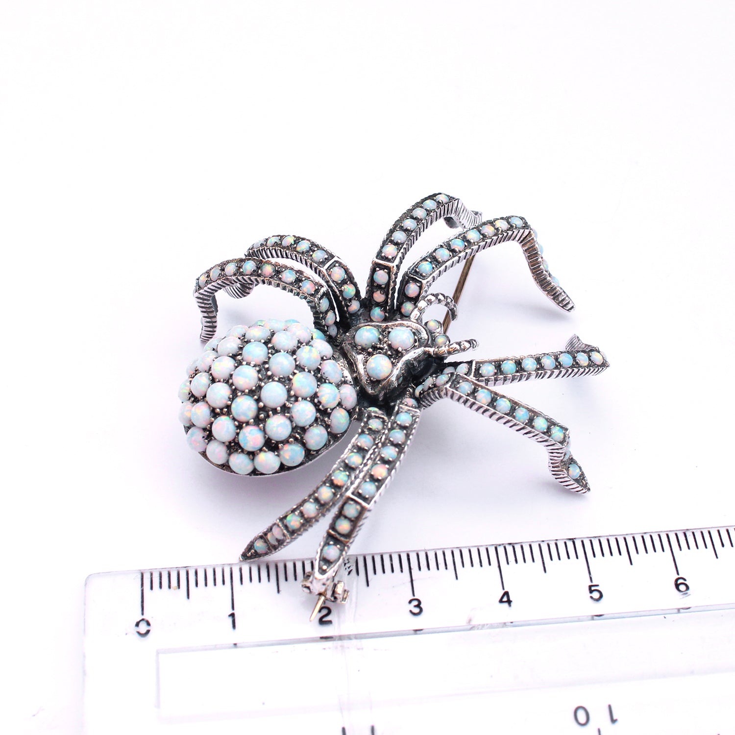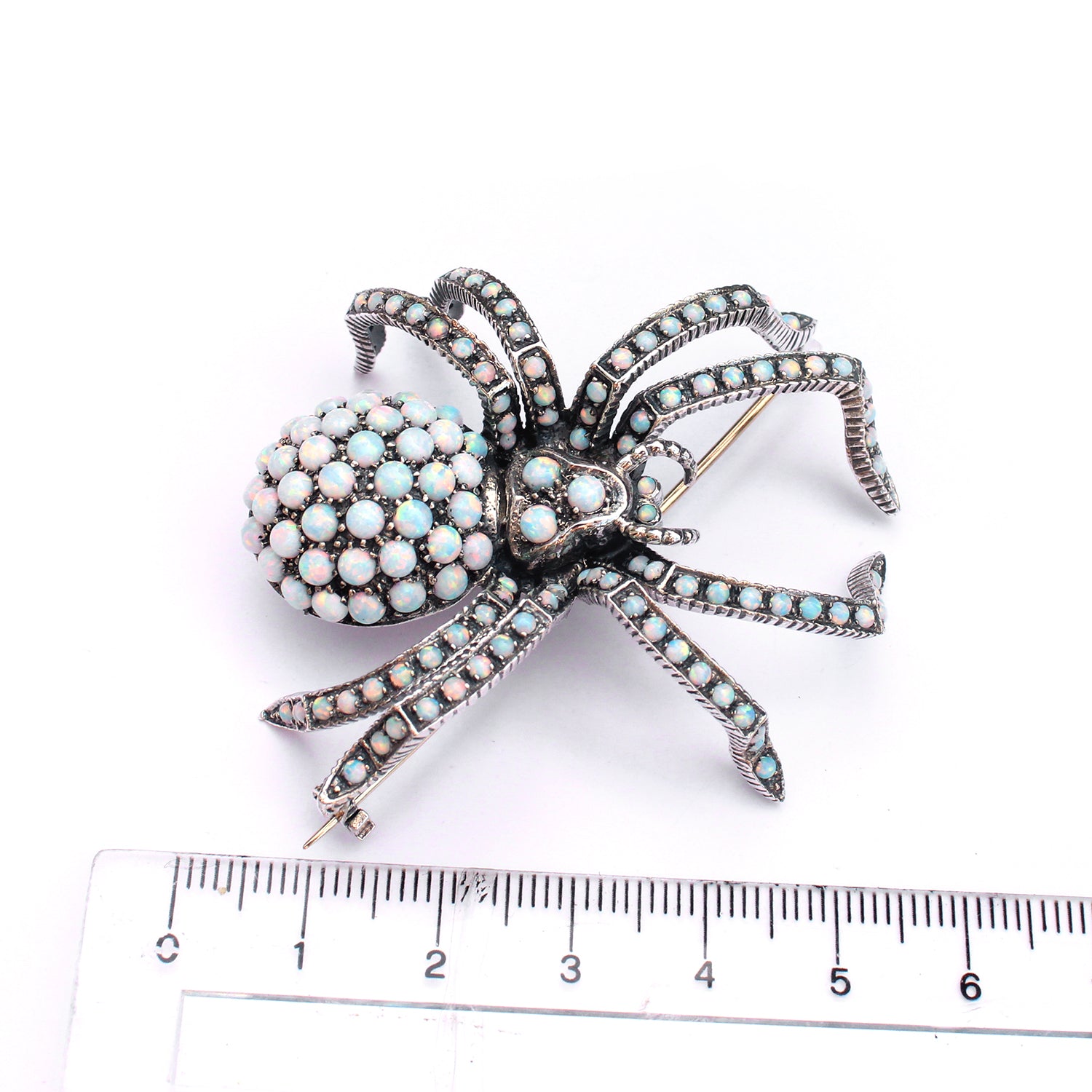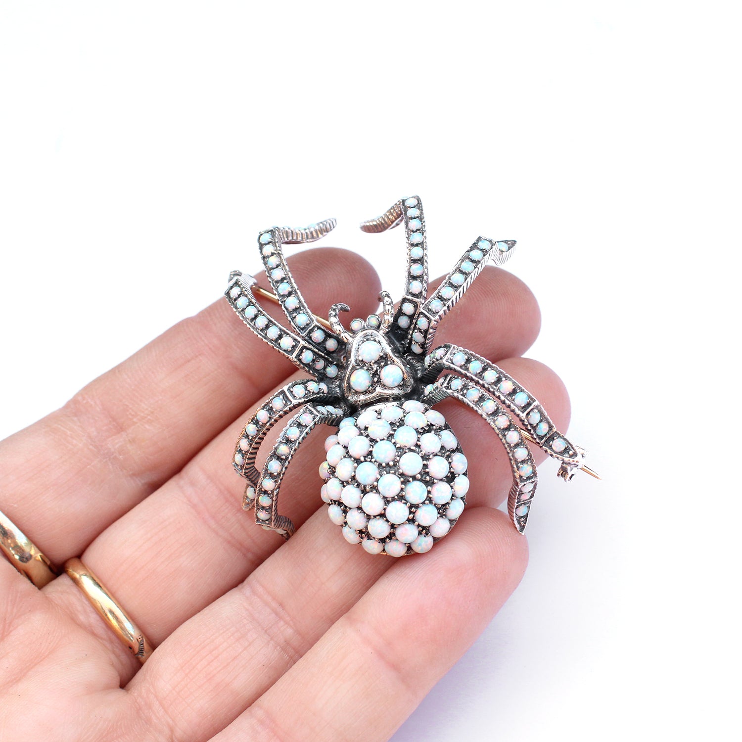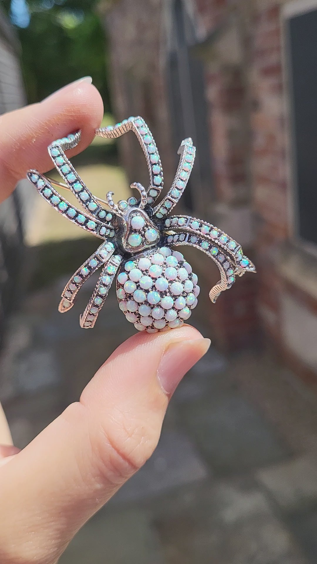A truly impressive and eye-catching solid silver spider brooch, entirely set with shimmering cultured opals. Each opal is alive with vibrant flashes of colour—greens, blues, pinks, and fiery oranges—that come alive in the light. The photos hardly do it justice; in person, the play of colour is mesmerising.