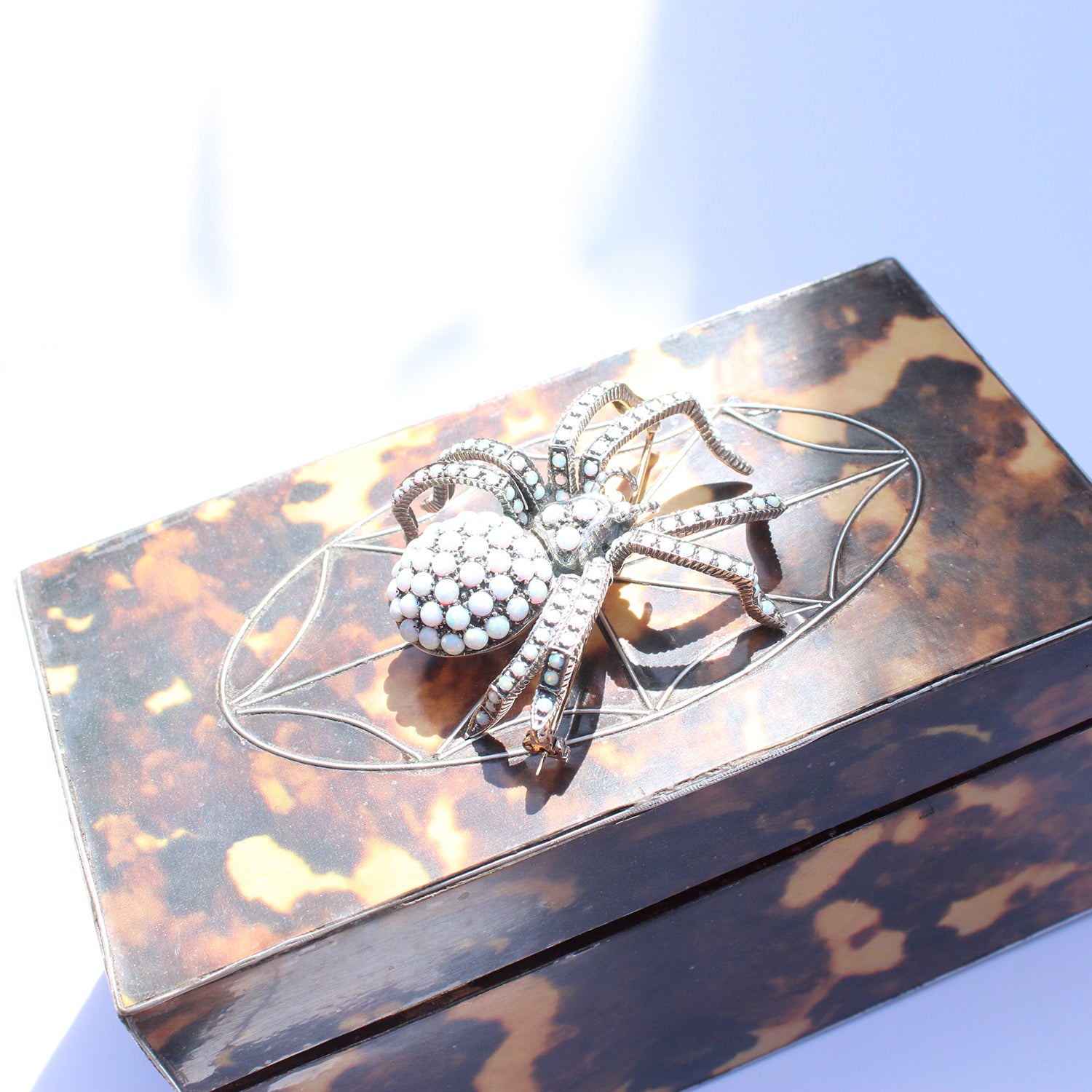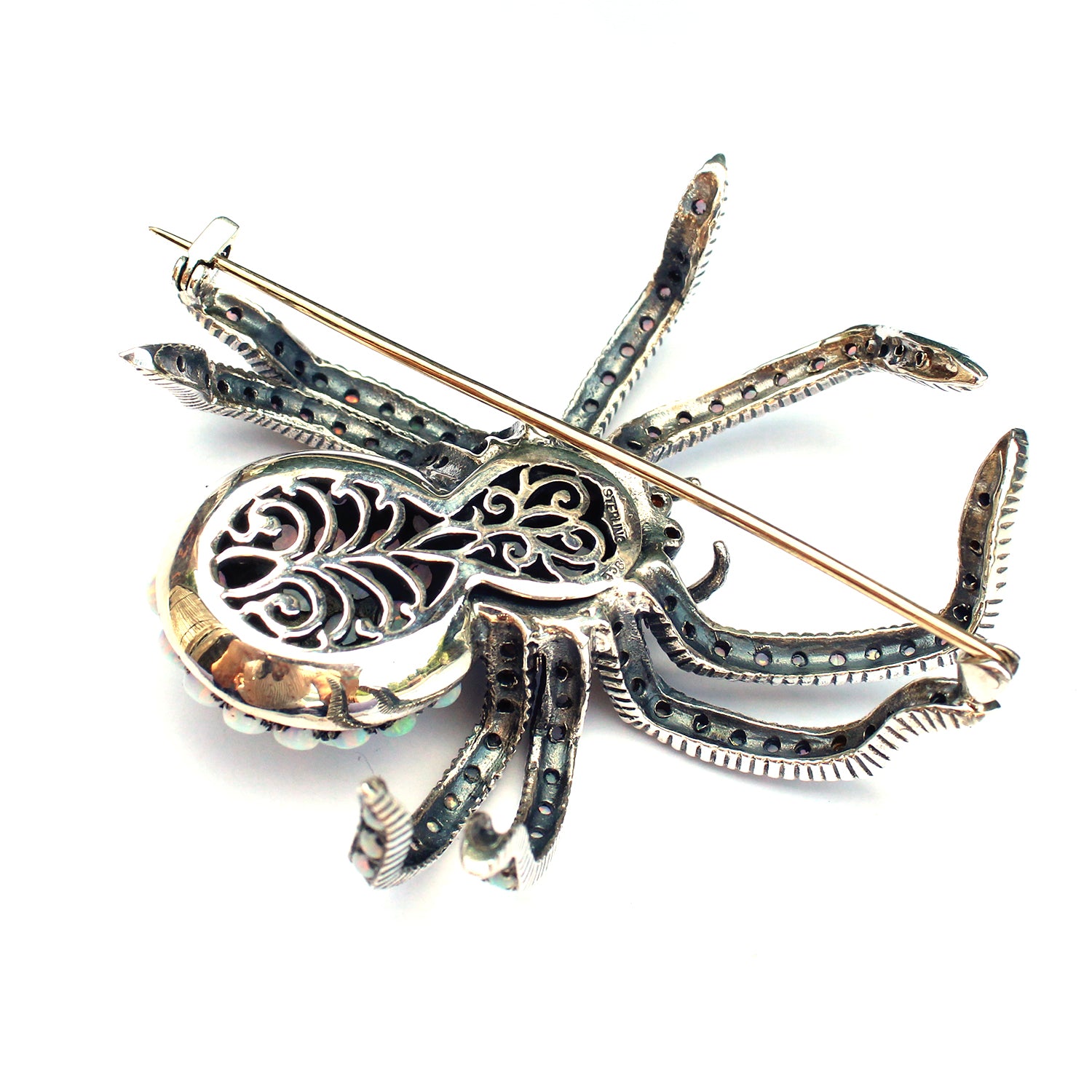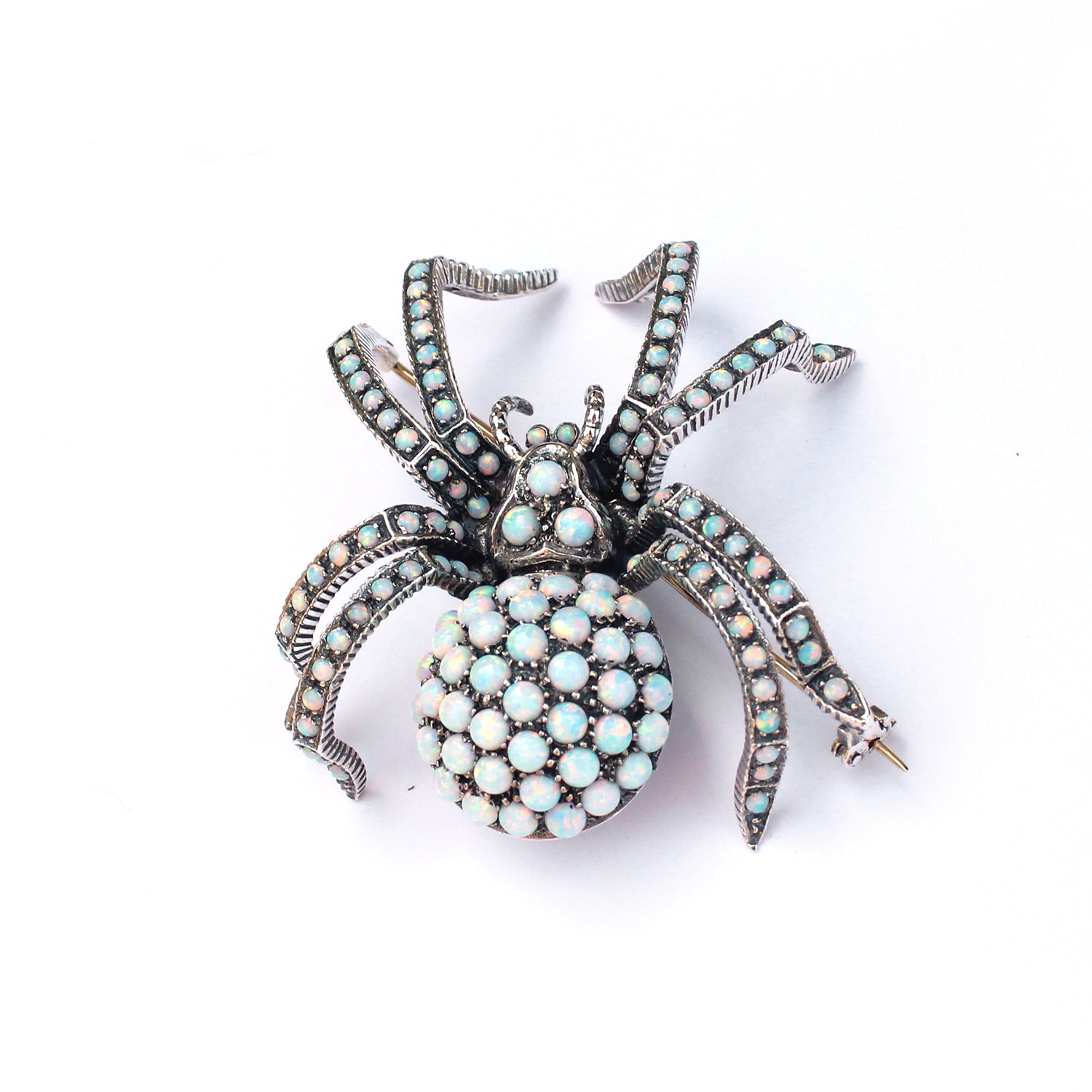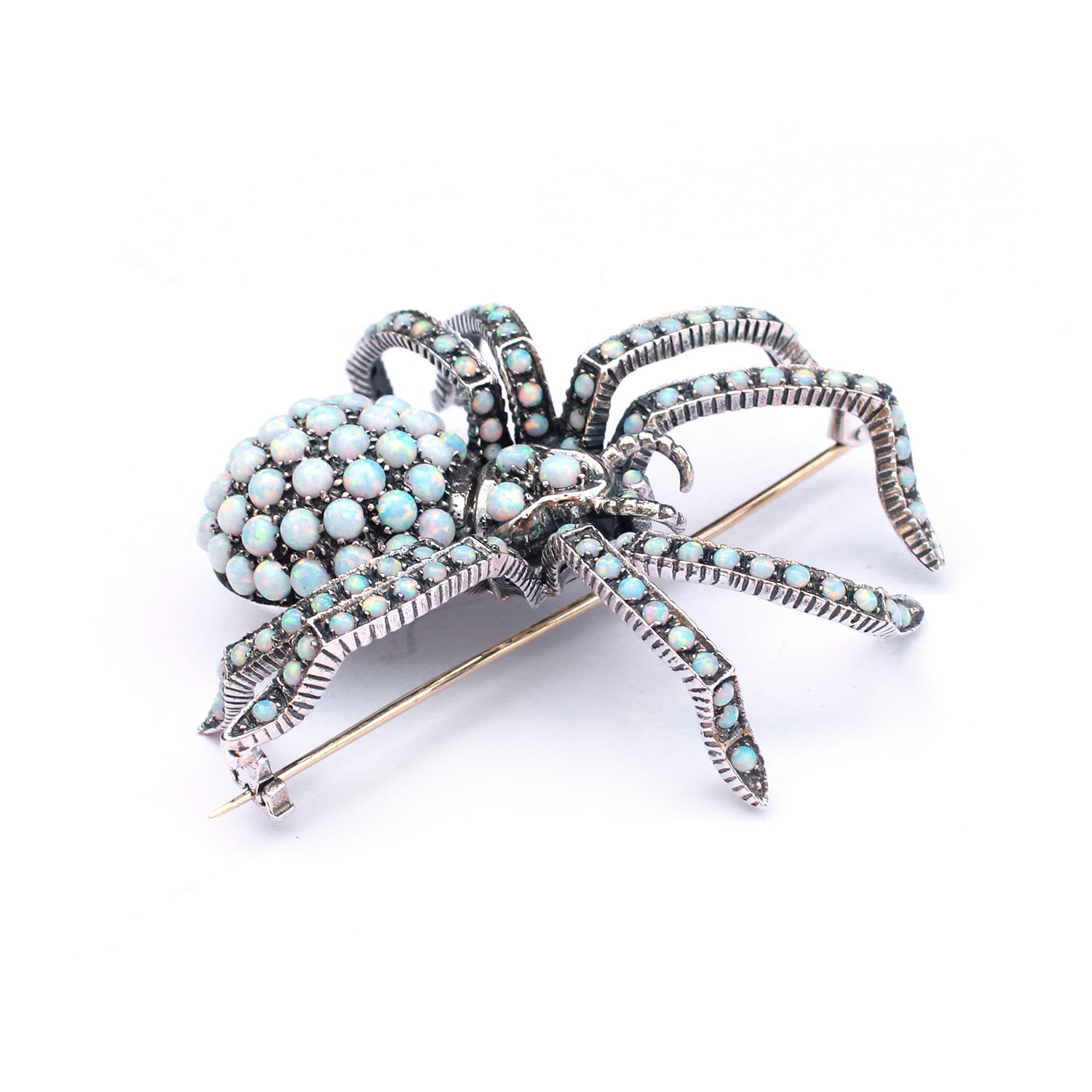 A truly impressive and eye-catching solid silver spider brooch, entirely set with shimmering cultured opals. Each opal is alive with vibrant flashes of colour—greens, blues, pinks, and fiery oranges—that come alive in the light. The photos hardly do it justice; in person, the play of colour is mesmerising.