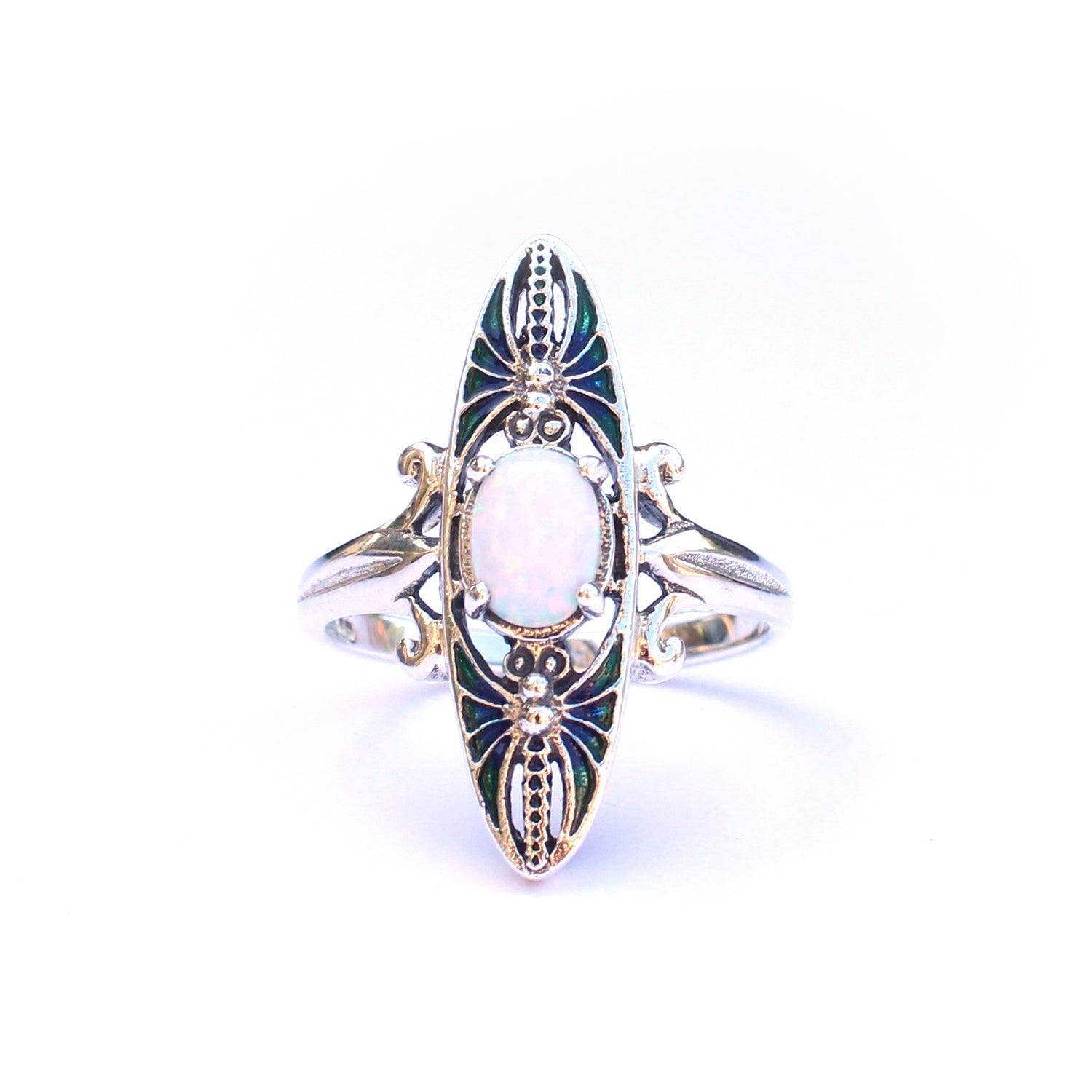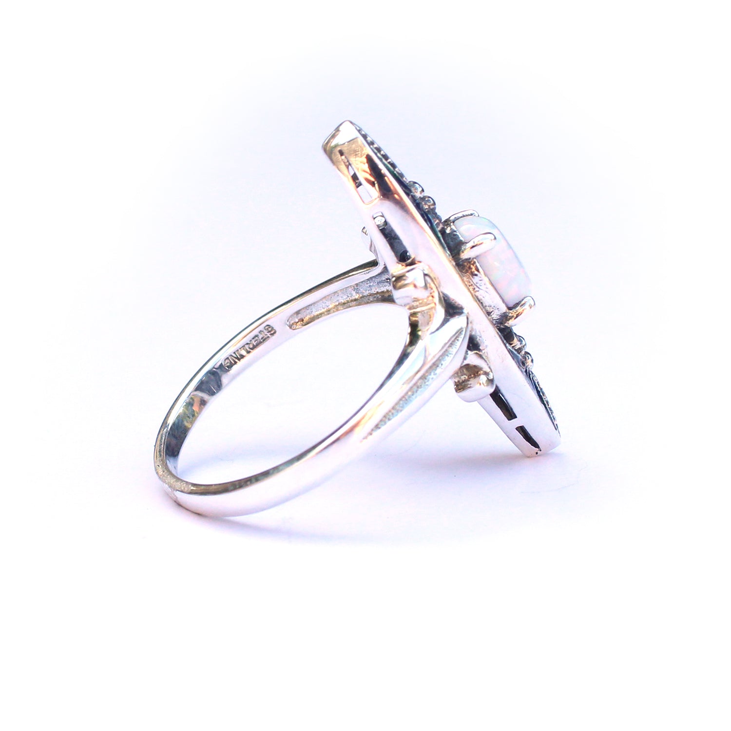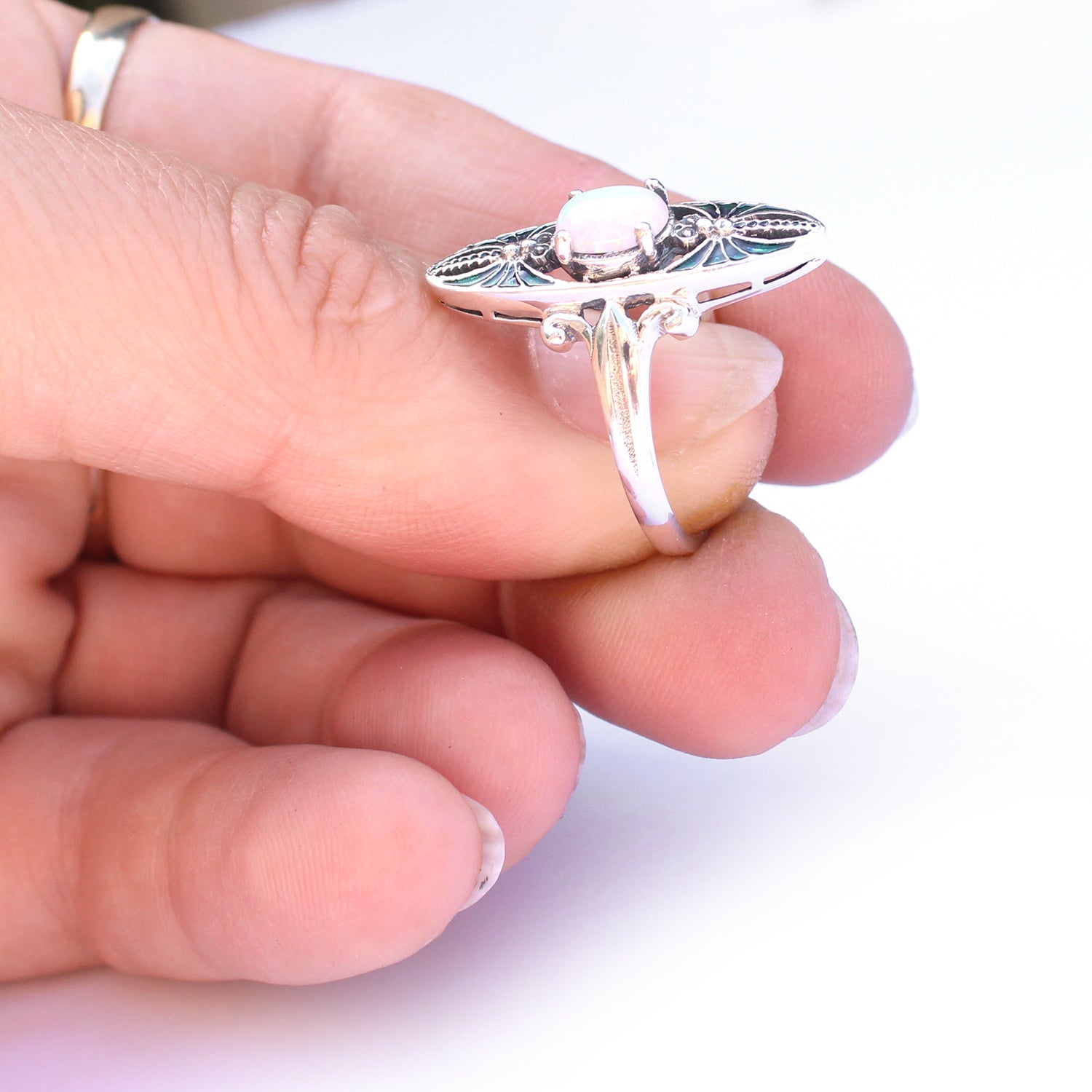 Sterling Silver Opal & Blue Enamel Navette Ring