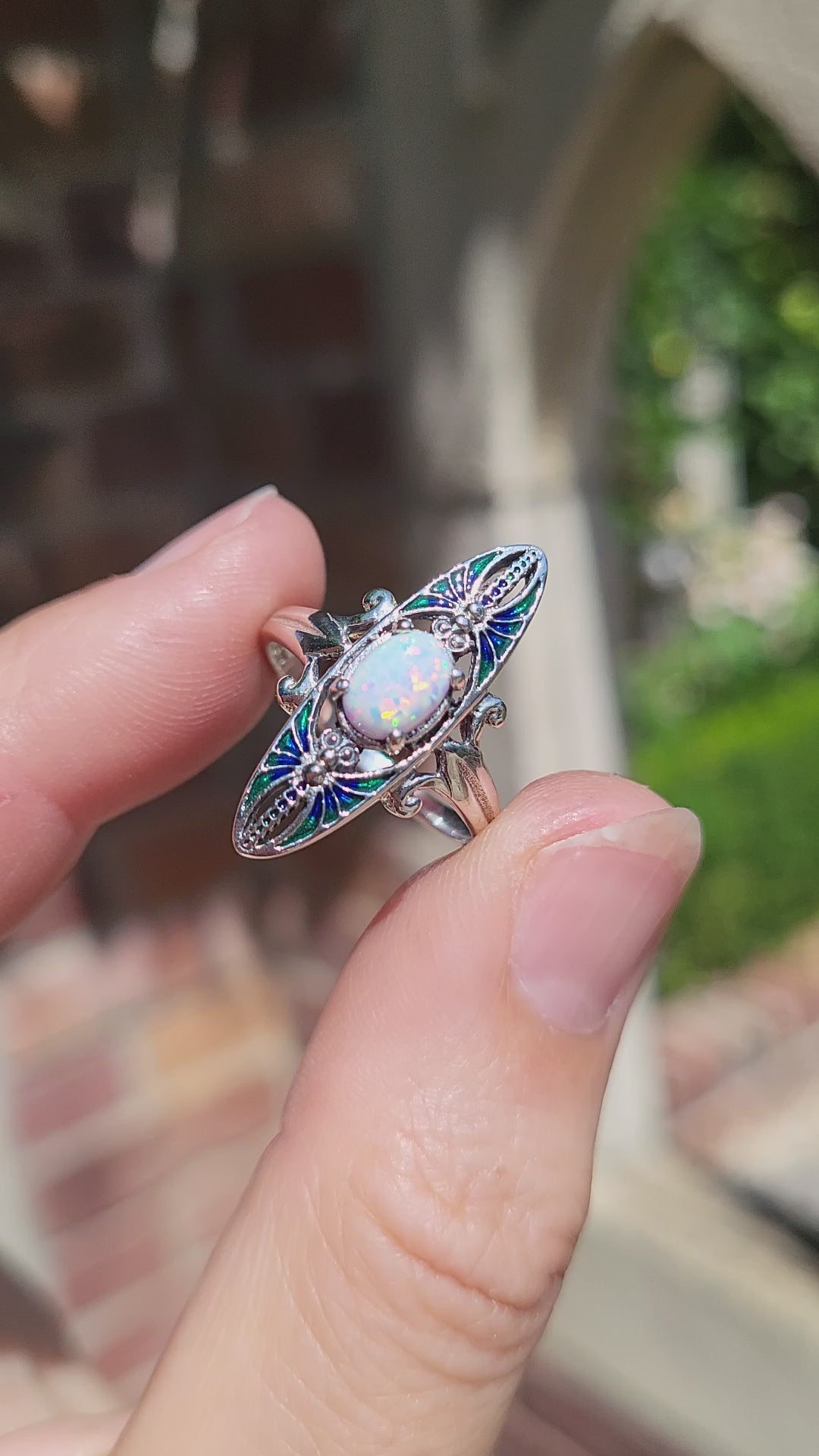 Elegant and eye-catching, this Sterling Silver Navette Ring features a glowing cultured opal at its heart, radiating flashes of colour with every movement. Framing the opal is a beautifully detailed border of deep blue enamel, adding rich contrast and a timeless vintage feel. Crafted in the classic navette shape, this ring elongates the finger beautifully and offers a lovely balance of colour, sparkle, and antique-inspired charm.