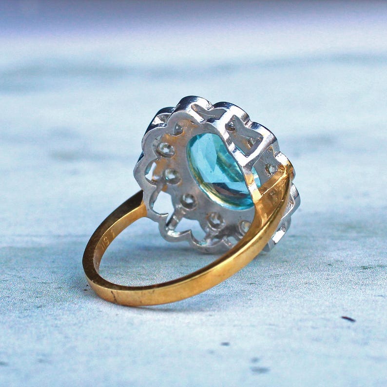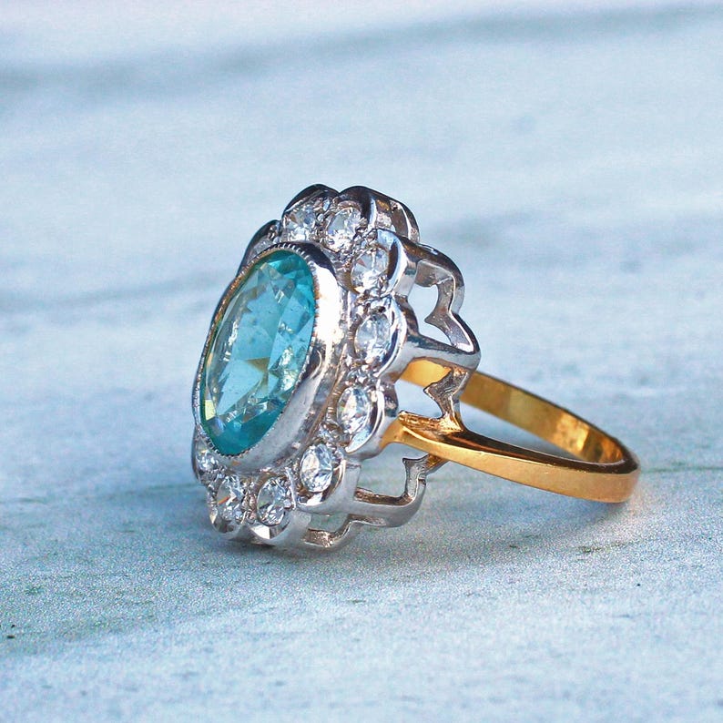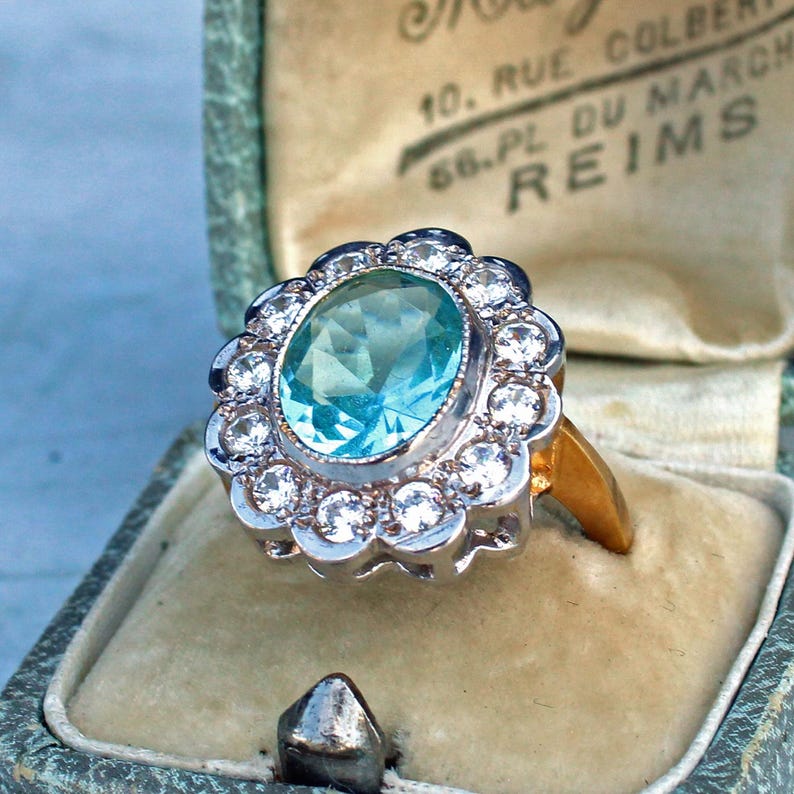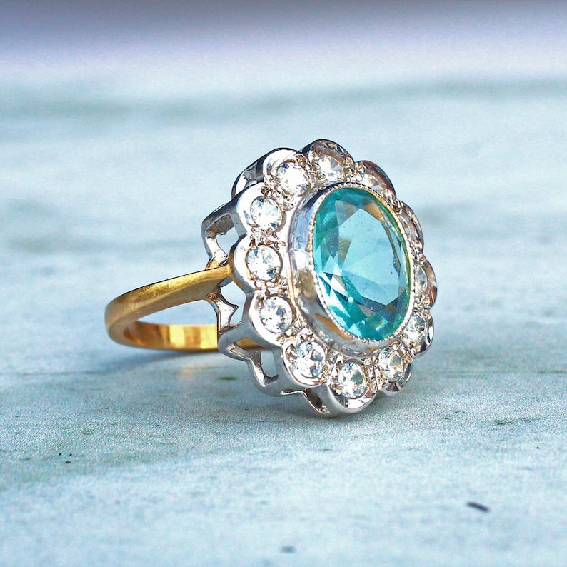 An impressive ring with big finger presence, this ring boasts a striking pale blue paste stone at its centre, reminiscent of Aquamarine. The central gem is encircled by a dazzling halo of cubic zirconia, designed to mimic the brilliance of diamonds and enhance the ring’s radiant presence. Crafted in solid sterling silver, this timeless design offers both beauty and glamour, making it a perfect statement piece for any occasion.