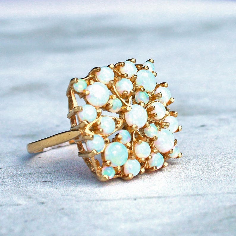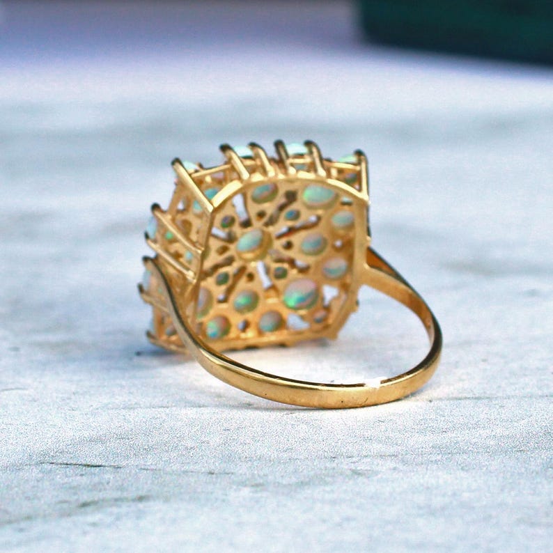 This striking ring features a square-shaped plaque adorned with a cluster of luminous created opal cabochons, each displaying a play of colour that shimmers beautifully in the light. Crafted in solid sterling silver with a rich gold vermeil finish, the design sits flush to the finger, making it both elegant and highly wearable. A wonderful choice for opal lovers, or those with an October birthday.