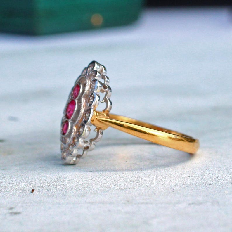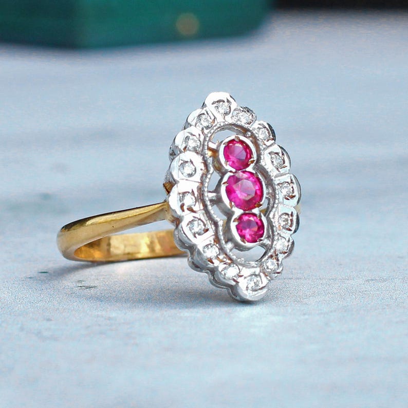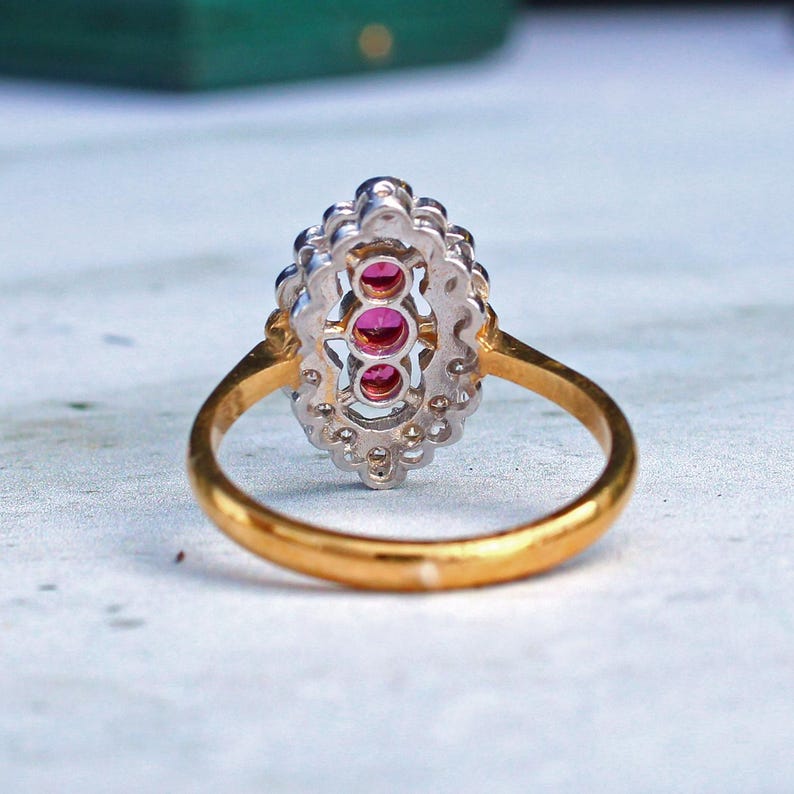 A stylish piece that captures the design elements of the Art Deco era. Crafted in sterling silver with a layer of rich gold vermeil, this ring showcases the symmetry and geometric precision typical of the 1920s. At its heart sit three vivid ruby-pink paste stones, arranged vertically for a striking focal point. Surrounding them is a decorative openwork design, accented with a border of sparkling clear paste stones that shimmer beautifully against the gold finish.