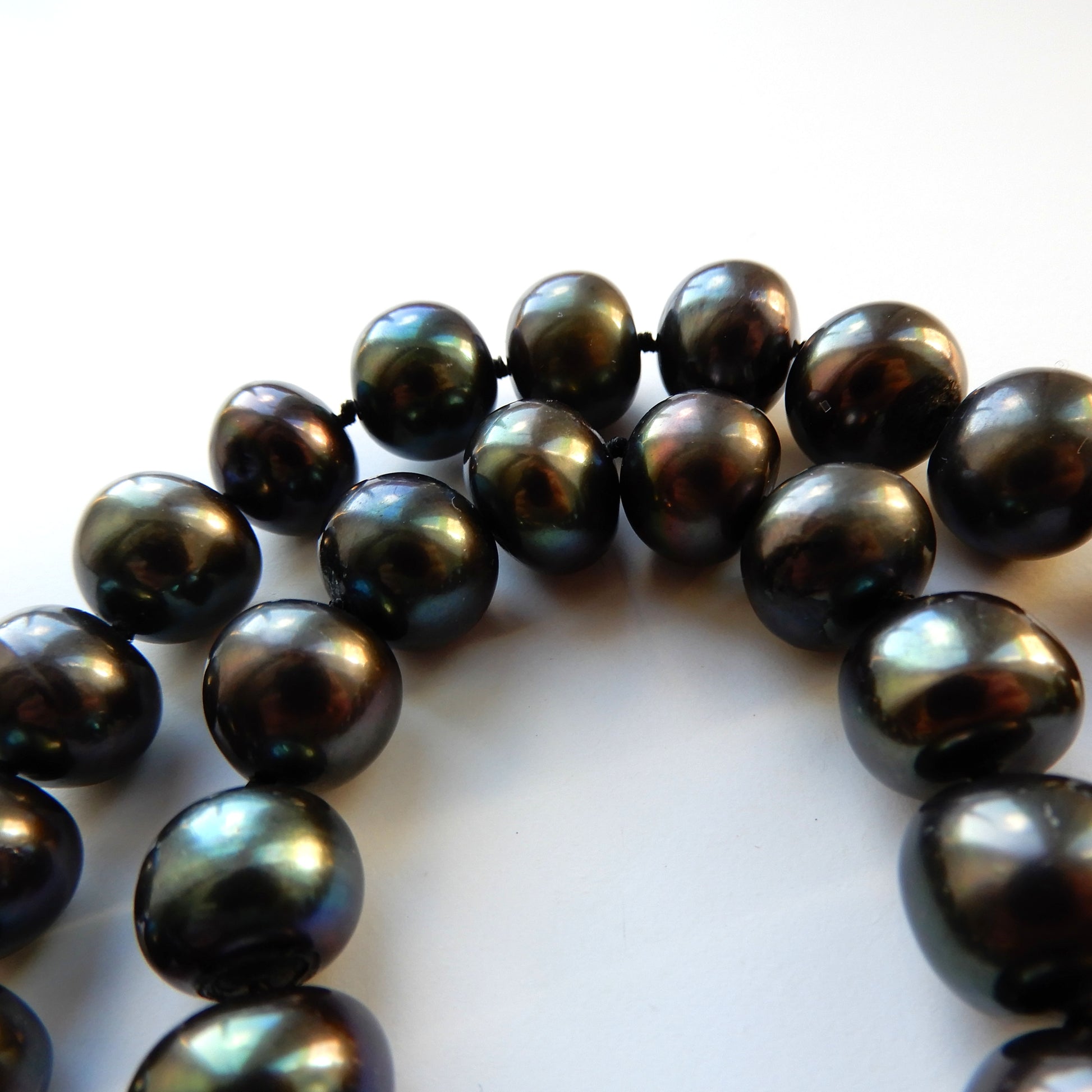 A truly decadent strand of dark Tahitian baroque pearls, each one showcasing its own natural silhouette and a captivating, moody lustre. These pearls carry that unmistakable Tahitian glow — shifting tones of charcoal, silver, and peacock. These pearls are wonderfully generous in size, giving the necklace a luxurious presence while still feeling effortlessly wearable.