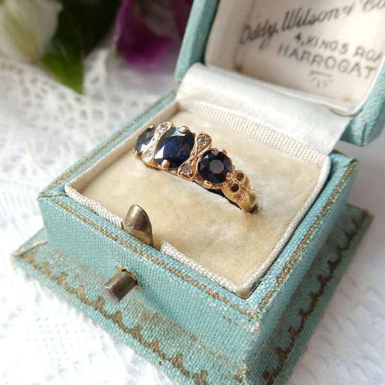 An exceptional vintage 10ct gold Sapphire Ring. This classic ring is crafted 10ct gold featuring three dark inky blue colored Sapphires. The Sapphires are flanked by four small Diamond chips. This is a lovely ring to wear with amazing finger presence. A gorgeous vintage 10ct gold Sapphire ring!