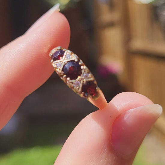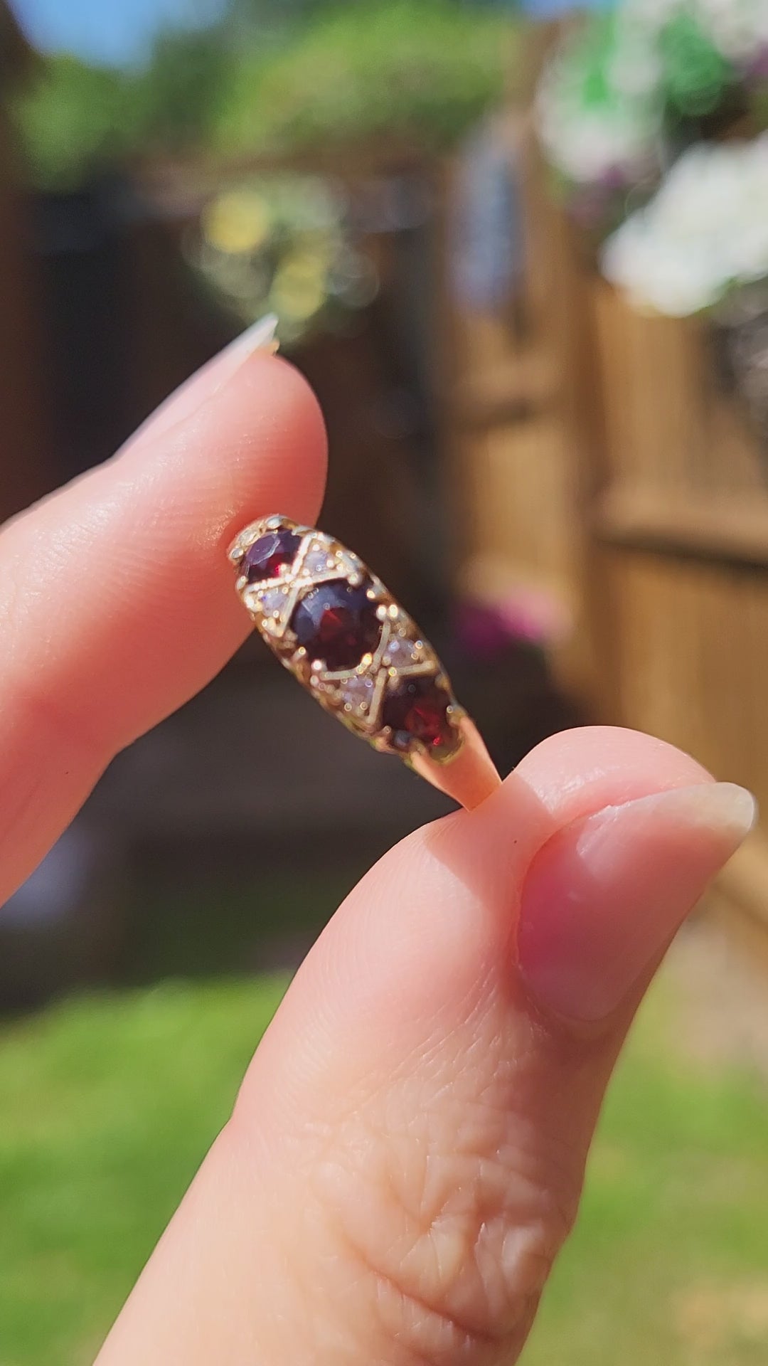 A very special vintage 9ct gold gypsy ring, set with three deep crimson garnets and sparkling paste stones flush to the band. Crafted with classic gypsy-style precision, this bold yet elegant piece sits beautifully against the finger — smooth, comfortable, and perfect for everyday wear. A striking example of vintage craftsmanship, full of warmth, depth, and that timeless allure. We hope the photos capture even a fraction of its real-life magic!