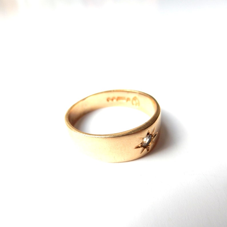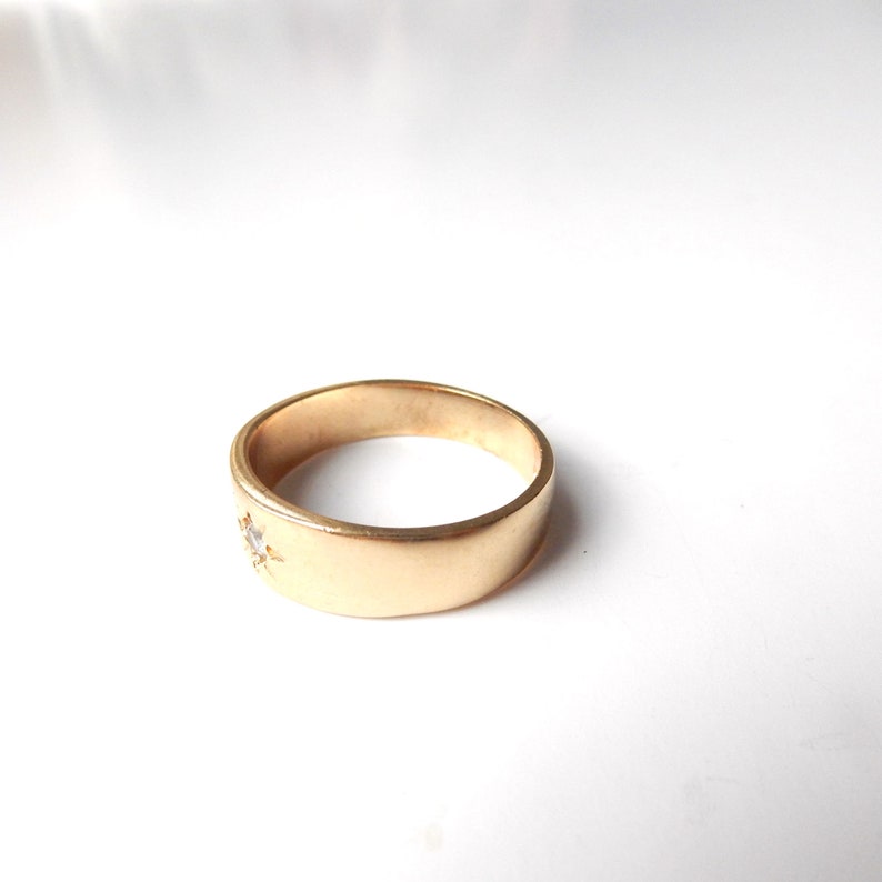 A beautiful vintage 9ct gold ring. This incredible 9carat gold wide band features one large CZ stone set flush to the band in a celestial star setting. This is a very eye catching ring which sits beautifully on the finger. This ring is perfect for stacking but beautiful enough to be worn alone. A beautiful celestial 9ct gold band!