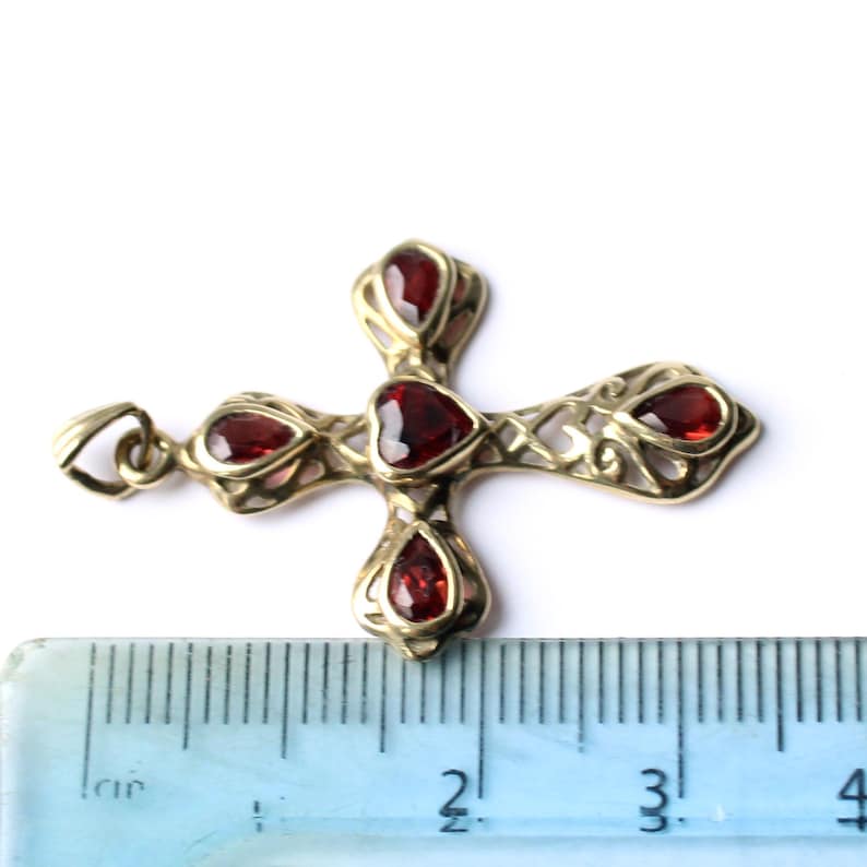A beautiful vintage 9ct gold garnet cross pendant, weighing approximately 2.2 grams. Designed as a crucifix, the pendant is adorned with five deep red garnets, with a striking heart-shaped garnet at the centre. The remaining garnets accent the arms of the cross, creating a rich, balanced look. Crafted in warm 9ct gold, the piece features an elegant openwork design that adds depth and lightness, enhancing its antique charm and making it a meaningful and eye-catching vintage pendant.
