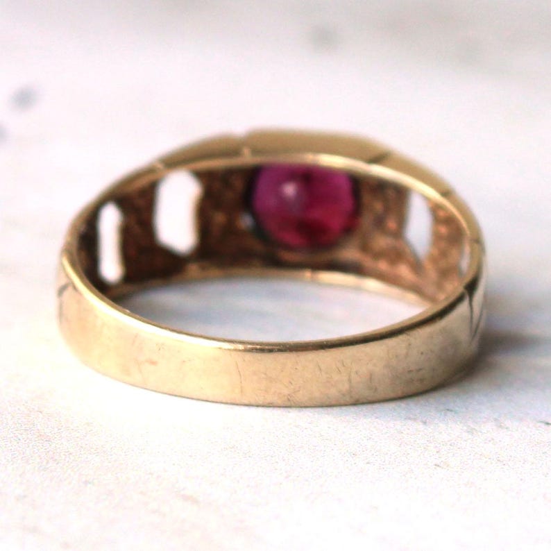 A single, deep-red garnet takes center stage on this striking 9ct gold ring. The openwork band adds a bold, chunky statement without the weighty price tag, making it perfect for everyday glamour or special occasions.