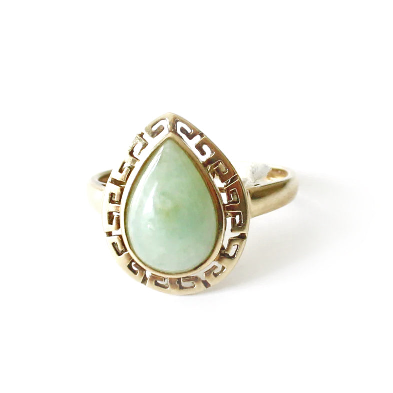 An enchanting vintage 9ct gold Jade ring. This unique ring features a pear shaped Jade gemstone, the Jade has a soft subtle translucent hue. The Jade is framed in a wonderful Greek Key border; I am a sucker for anything with a Greek Key design so I was very excited to have found this unusual piece! This beautiful ring most certainly has finger presence & it sits really comfortably on the finger.