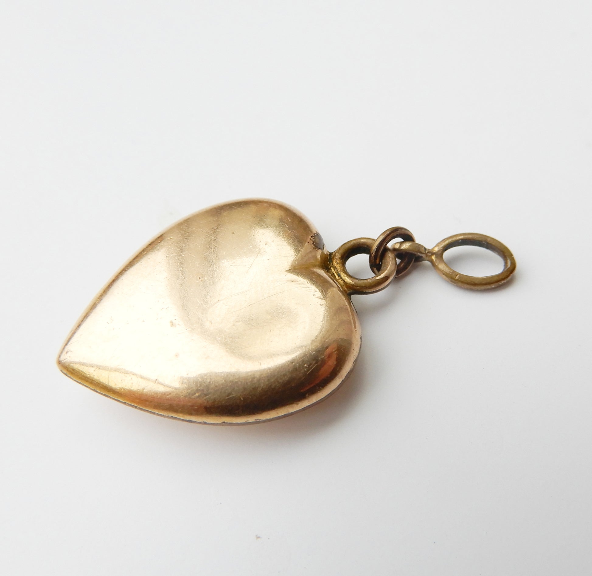 A very pretty antique rolled gold puffy heart. This sweet rose gold puffy heart has an eye catching seed pearl in an etched star setting. A wonderful piece of vintage keepsake jewellery!