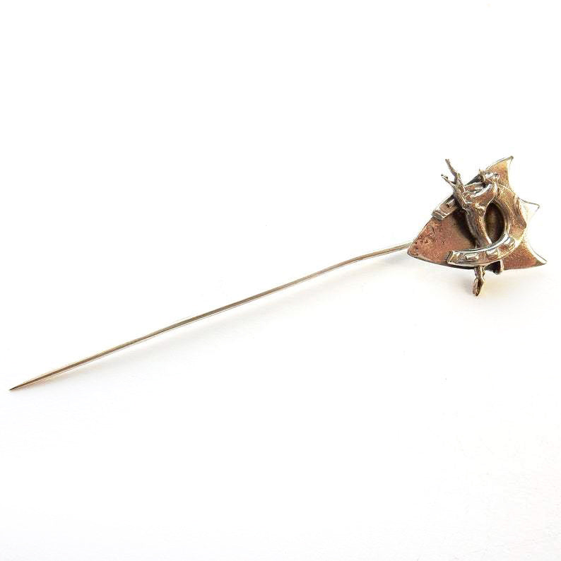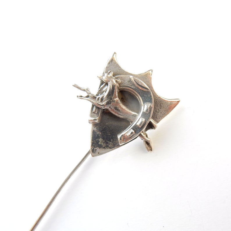 A charming sterling silver novelty stick pin. This beautiful piece has wonderful detail of a galloping horse and a horse shoe. A beautiful collector's item. A fabulous silver lucky horse shoe stick pin!