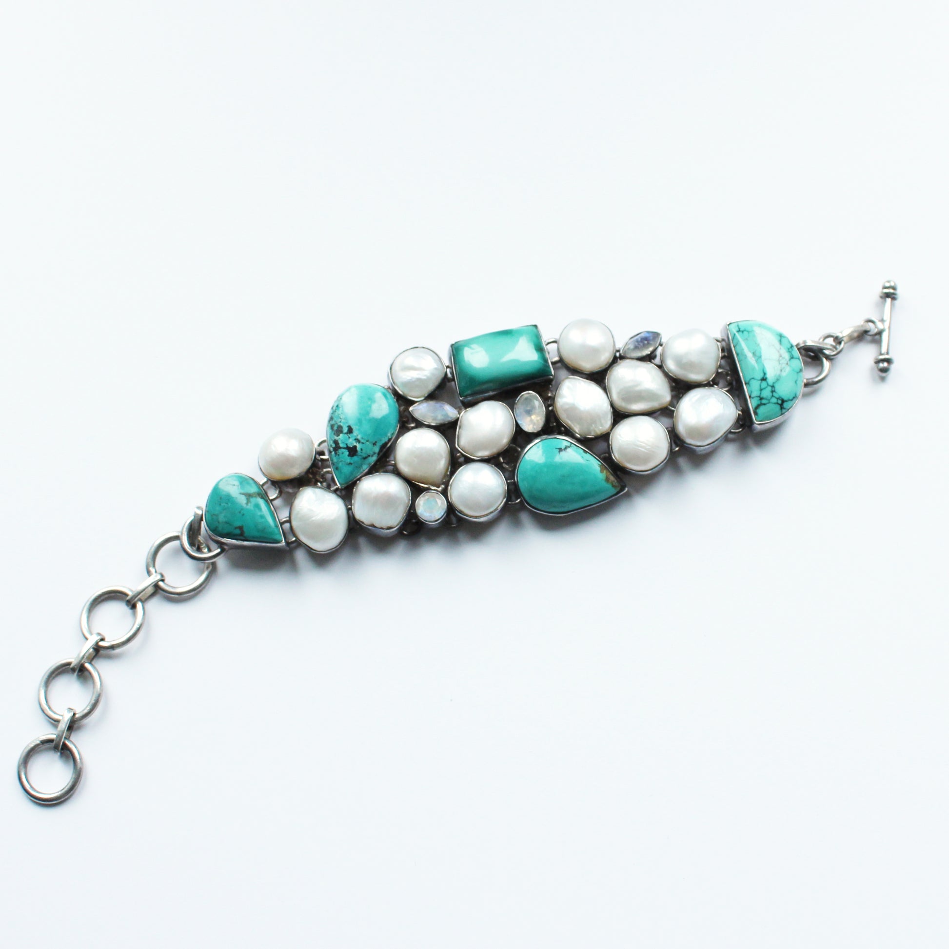 A truly remarkable artisan-made bracelet of exceptional quality, weighing an impressive 56 grams. This piece brings together a stunning combination of moonstone, turquoise, and lustrous pearls — the pearls themselves boasting a beautiful, glowing lustre. The cool iridescence of the moonstone pairs perfectly with the vibrant turquoise and creamy pearls, creating a striking yet harmonious design. Fully hallmarked with English silver marks, the bracelet fastens securely with a toggle clasp and can be adjusted to fit. A substantial, elegant piece that feels as good to wear as it is to admire.