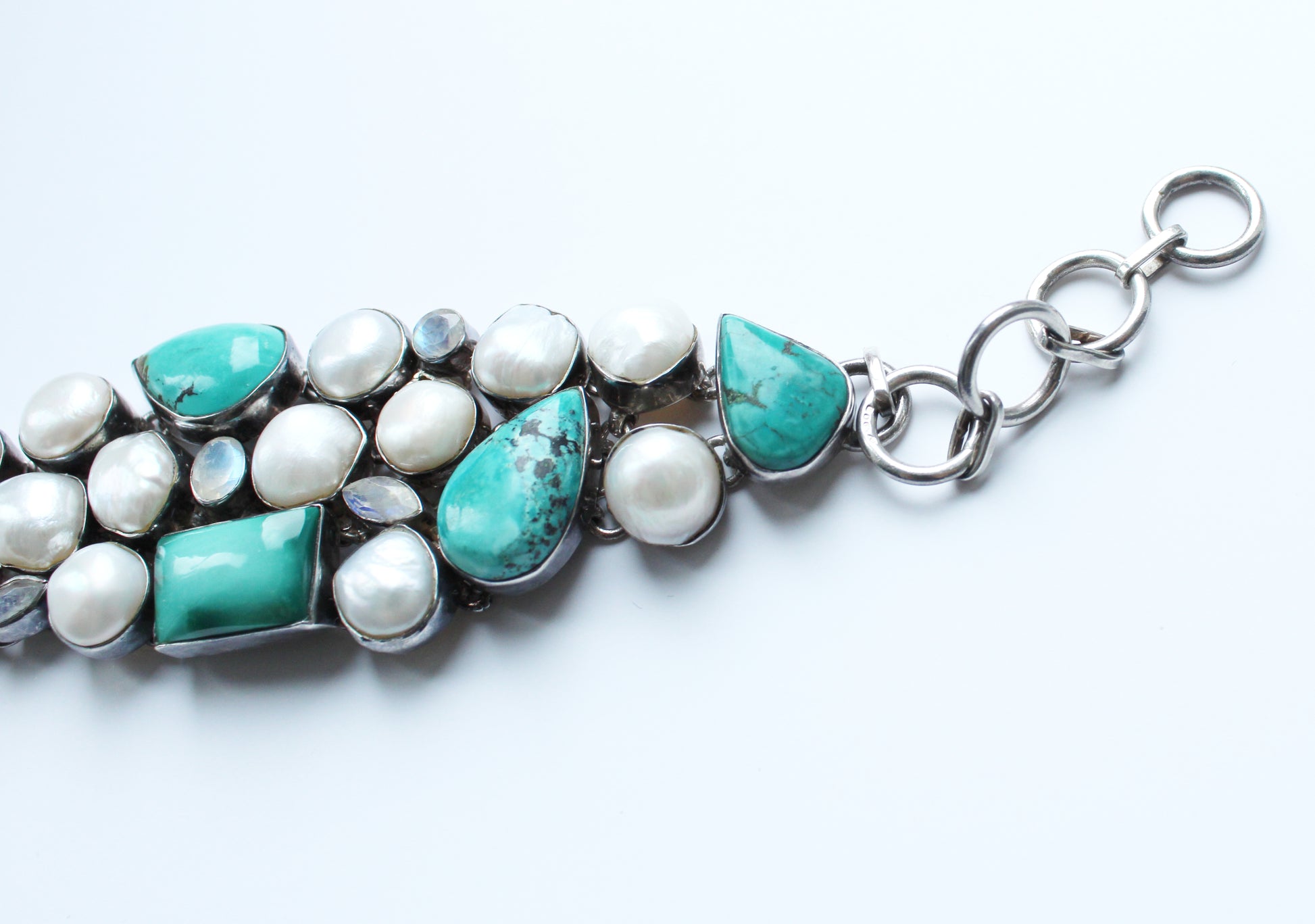 Vintage Sterling Silver Moonstone, Turquoise & Pearl Bracelet